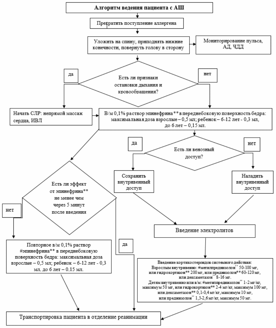 3. Пациенты с АШ на пищевые продукты должны исключить эти продукты из употребления и иметь при себе раствор эпинефрина** 0,1%, кортикостероиды системного действия в растворе, антигистаминные препараты для системного использования.