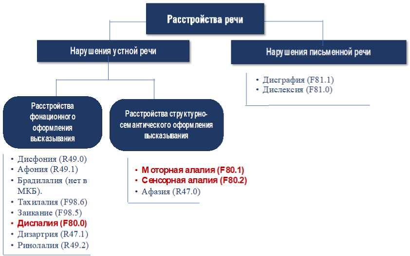 МКБ-10 эти нарушения отнесены к подрубрикам F80.0, F80.1, F80.2, а также G96.8. Под данными расстройствами понимают такие расстройства речи, при которых нормальное речевое развитие нарушено с ранних этапов и не является следствием черепно-мозговой травмы, нейроинфекции, эпилепсии, нейродегенеративных заболеваний, аутизма, задержки психического развития, умственной отсталости, тугоухости и других заболеваний ЦНС [