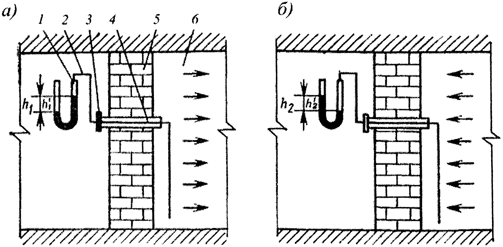 а, б - для поступающей и исходящей струй соответственно; 1 - микроманометр; 2 - резиновая трубка; 3 - перекрытие металлической трубы; 4 - металлическая труба диаметром 100 мм; 5 - кладка перемычки; 6 - изолированная часть выемочного участка