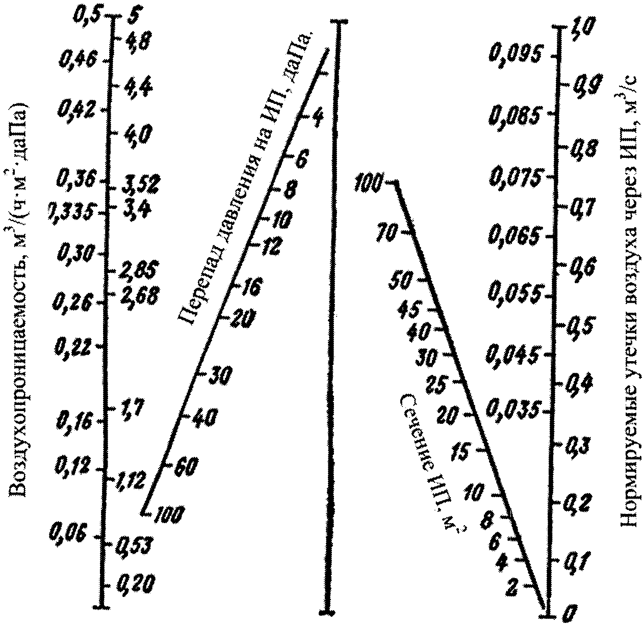 на шкалах "Воздухопроницаемость" и "Перепад давления на ИП" номограммы через точки, соответствующие среднему меньшему значению воздухопроницаемости ИП и перепаду давления на ИП, проводится прямая линия до пересечения ее с центральной вертикальной линией. Через точку пересечения на второй вертикальной линии и точку на шкале "Сечение ИП" проводится прямая линия до пересечения ее со шкалой "Нормируемые утечки воздуха через ИП" для определения нормируемых утечек воздуха через ИП.