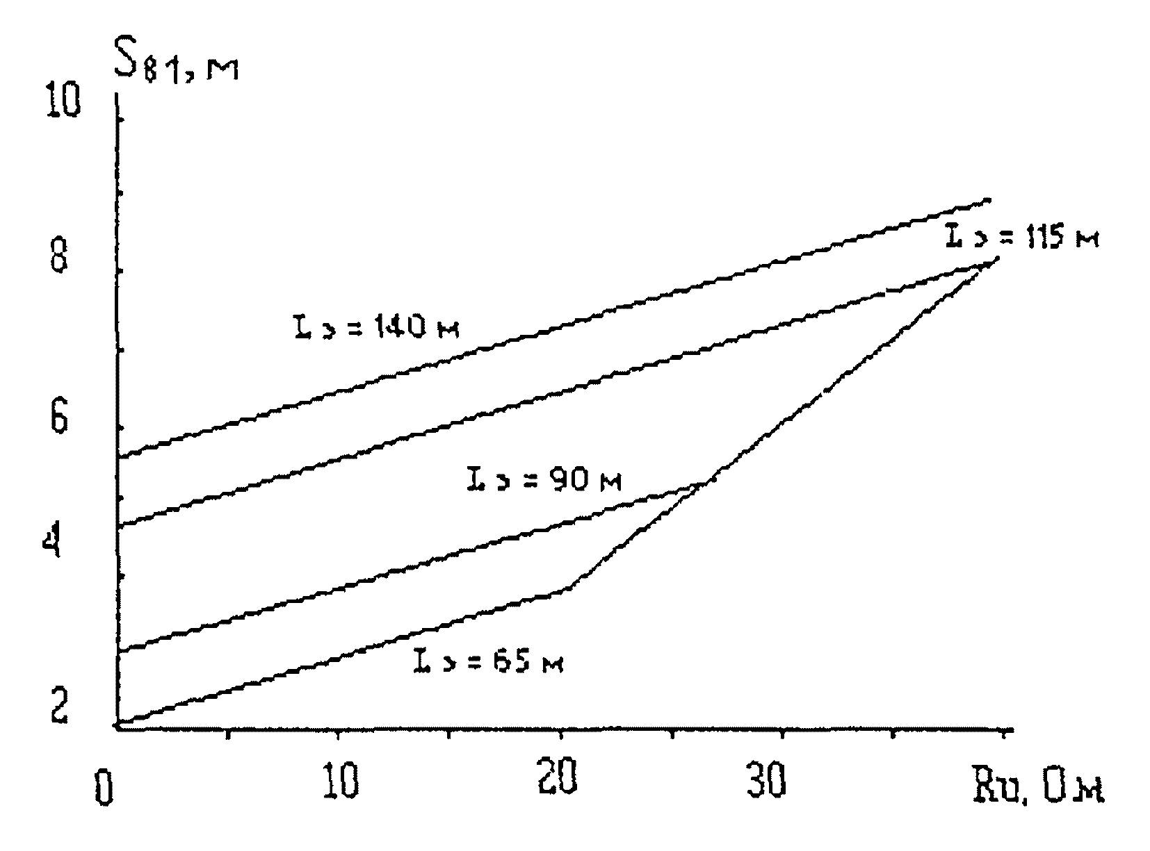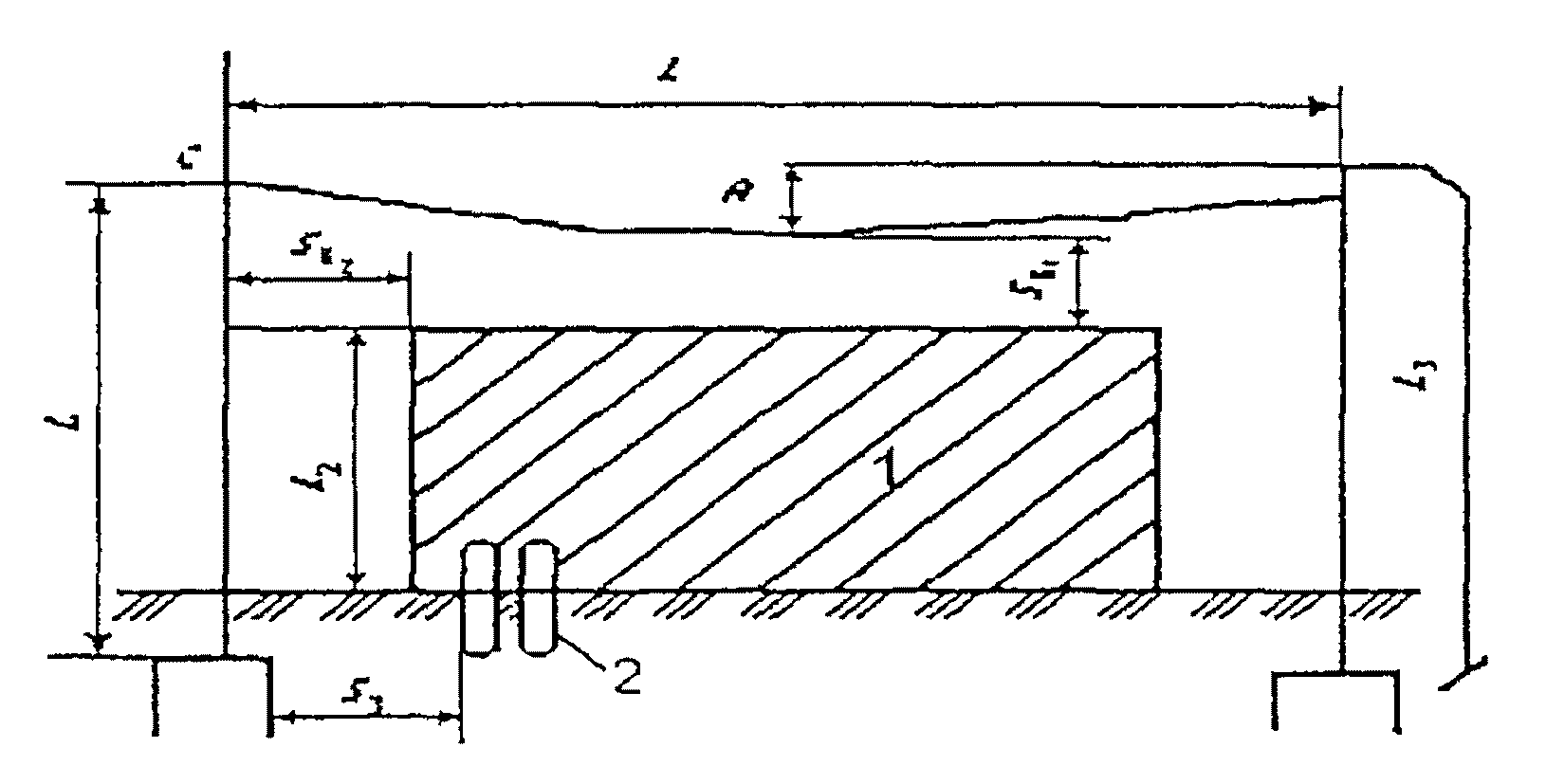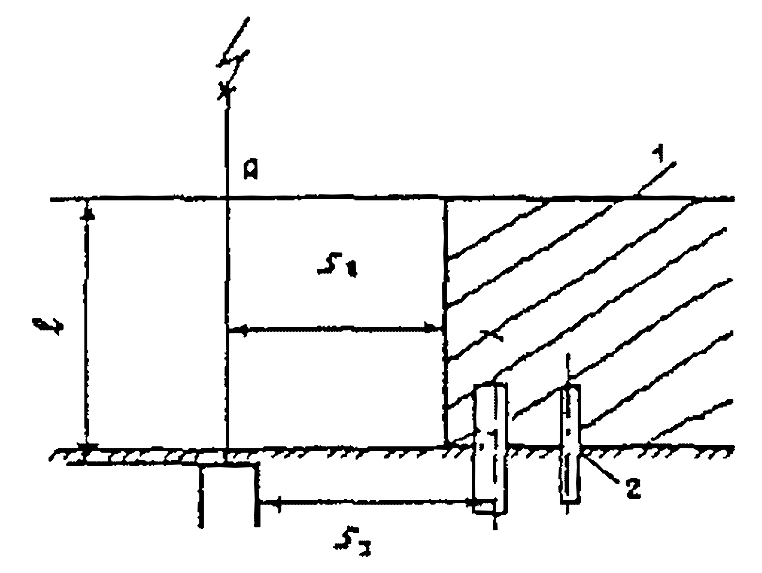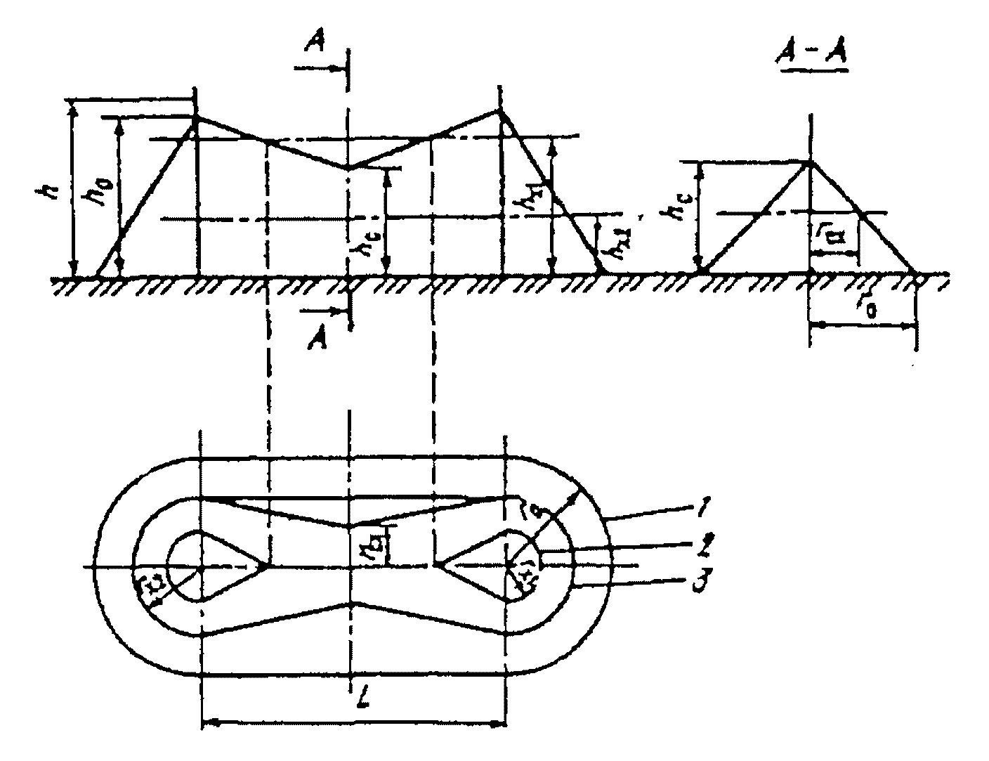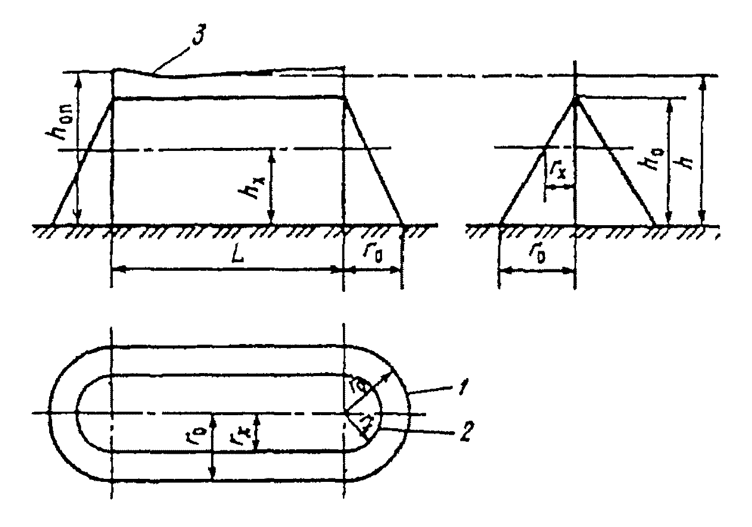 п. 7.3.1). Схема зоны защиты одиночного тросового молниеотвода: 1, 2 - границы зон защиты на уровне соответственно земли и высоты защищаемого сооружения; 3 - трос.