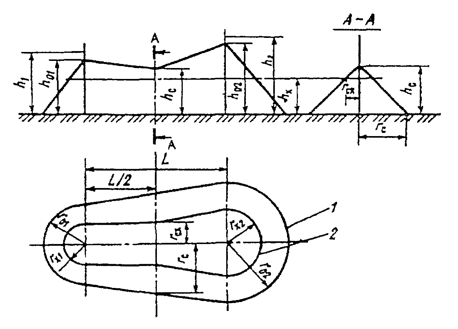 п. 7.2.2). Схема зоны защиты двух стержневых молниеотводов разной высоты: 1, 2 - границы зон защиты на уровнях соответственно земли и высоты защищаемого сооружения.