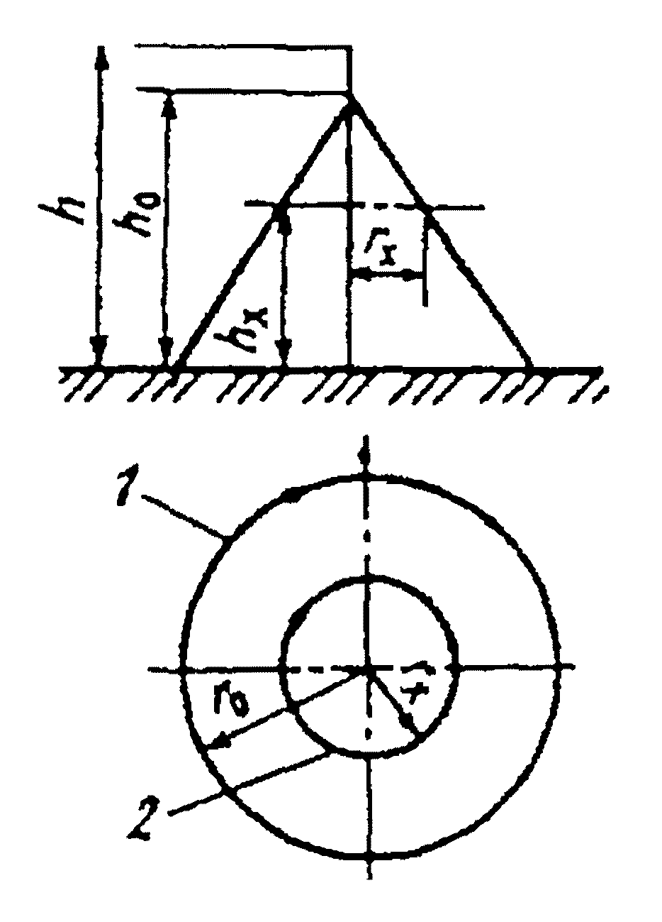 п. 7.1). Схема зоны защиты одиночного стержневого молниеотвода: 1, 2 - границы зоны защиты на уровнях соответственно земли и высоты защищаемого сооружения.