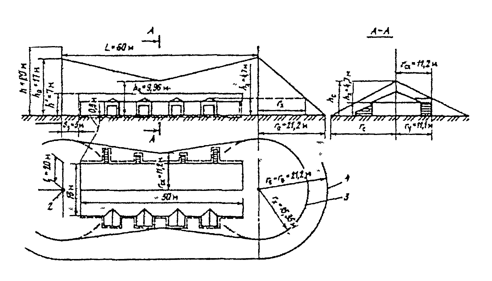 п. 11.14). Схема к примеру расчета молниезащиты хранилища взрывчатых материалов: 1, 2 - заземлители соответственно вторичного воздействия и молниеотвода; 3, 4 - границы зон защиты на уровнях соответственно высоты защищенного сооружения и земли.