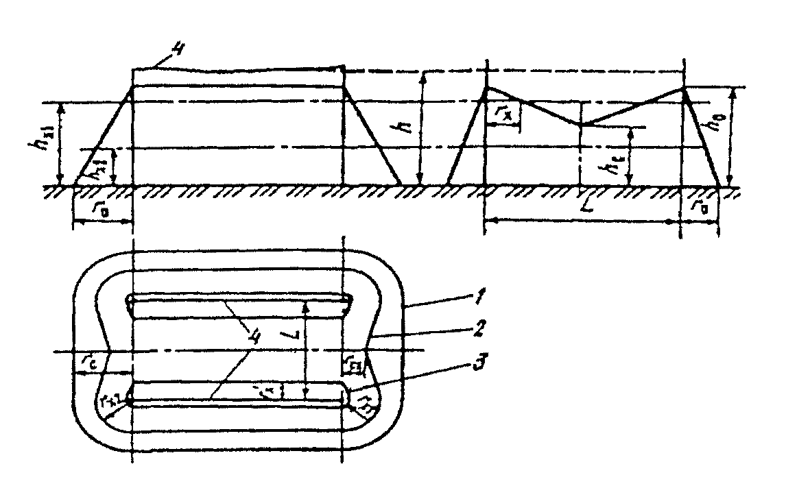 п. 7.5.1). Схема зоны защиты двойного тросового молниеотвода: 1, 2, 3 - границы зон защиты на уровнях соответственно земли и высот защищаемого сооружения; 4 - трос.