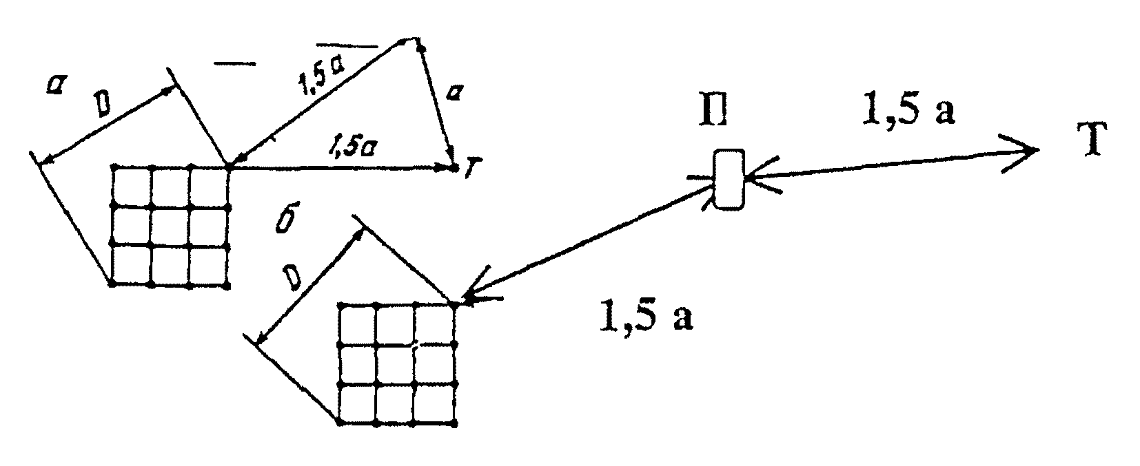 п. 11.11). Двухлучевая (а) и однолучевая (б) схемы расположения электродов при измерении сопротивлений сложных заземлений и одиночных горизонтальных полос: П - потенциальный электрод; Т - токовый электрод.
