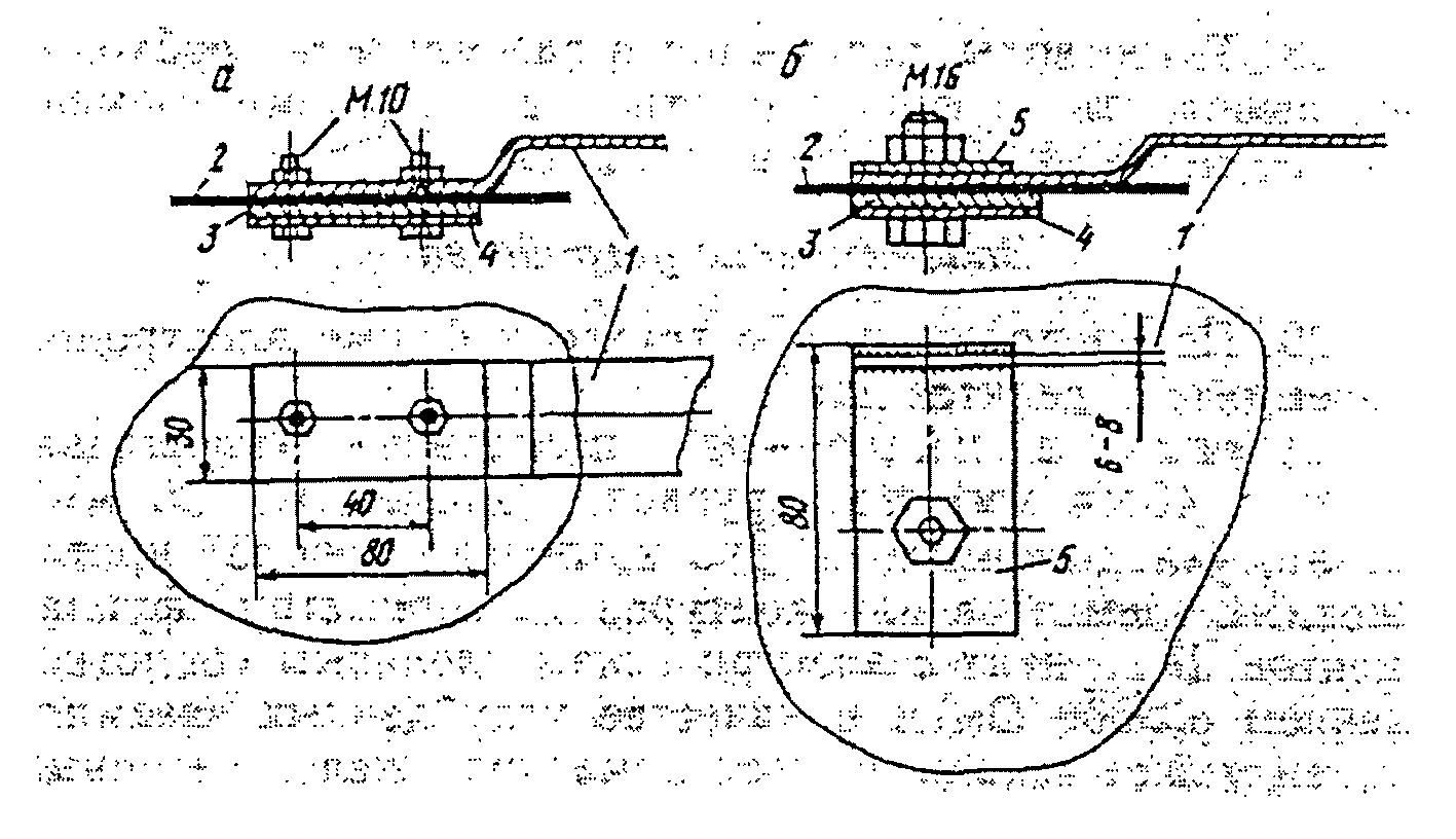 п. 8.1.7). Зажим для присоединения плоского (а) и круглого (б) токоотводов к металлической кровле: 1 - токоотвод: 2 - кровля; 3 - свинцовая прокладка; 4 - стальная пластинка: 5 - пластина с приваренным токоотводом.