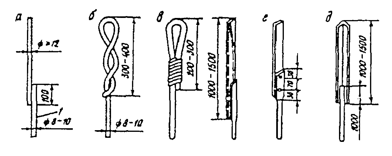 п. 8.1.5). Конструкции молниеприемников из круглой стали (а), стальной проволоки диаметром 2 - 3 мм (б), стальной трубы (в), полосовой стали (г), угловой стали (д): 1 - токоотвод.