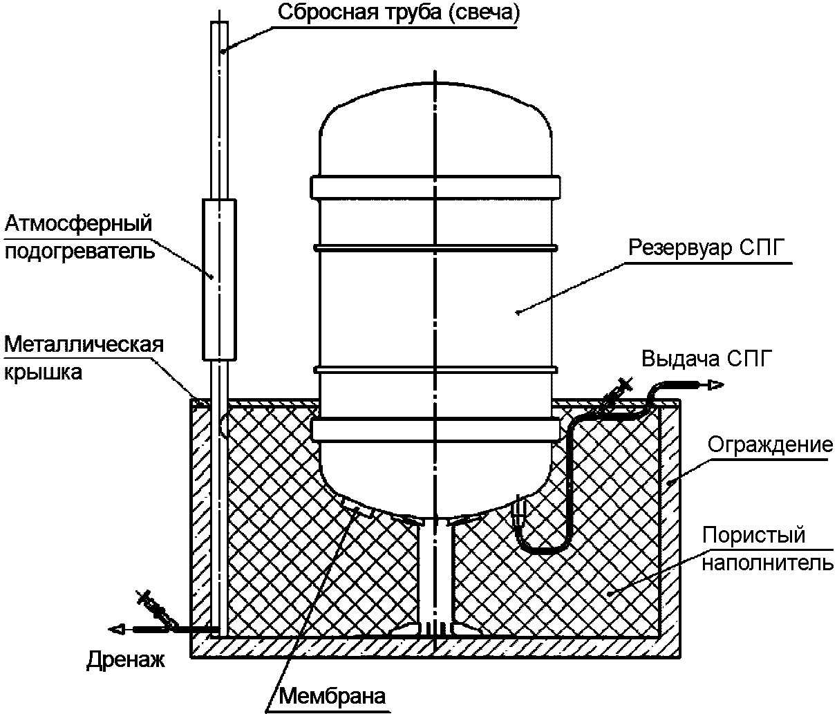 А.4 Для горизонтальных резервуаров СПГ весь резервуар должен располагаться внутри защитного ограждения и закрываться крышкой из негорючего газонепроницаемого материала, оснащенной системой газосброса (дренажной трубой), рассчитанной из условия сброса и эффективного рассеивания паров СПГ. При этом внутренний объем между крышкой и ограждением должен заполняться пористым материалом или пористой средой.