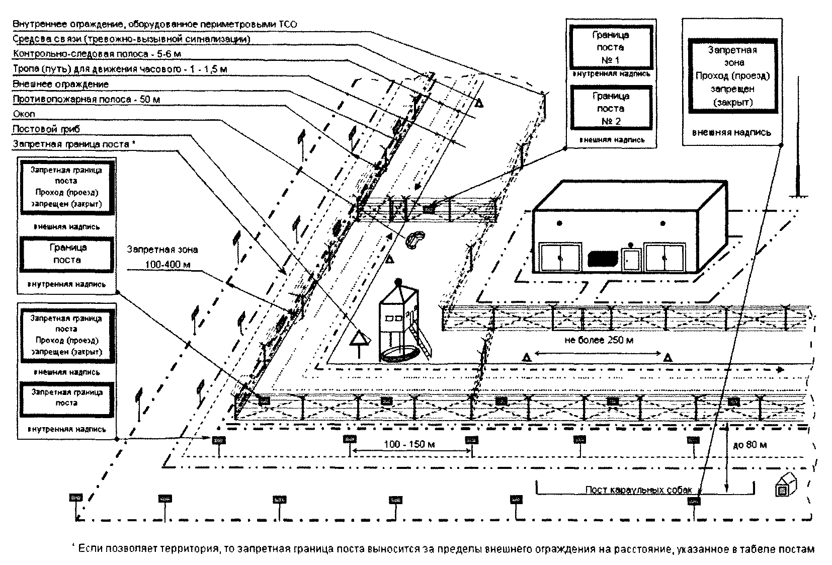 Посты караульных собак устанавливаются на наиболее опасных подступах к объекту впереди внешнего ограждения (постов) на удалении до 80 метров или между внешним ограждением и первым рубежом, оборудованным техническими средствами охраны, с учетом возможности обстрела местности впереди караульной собаки.