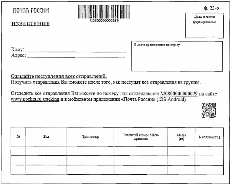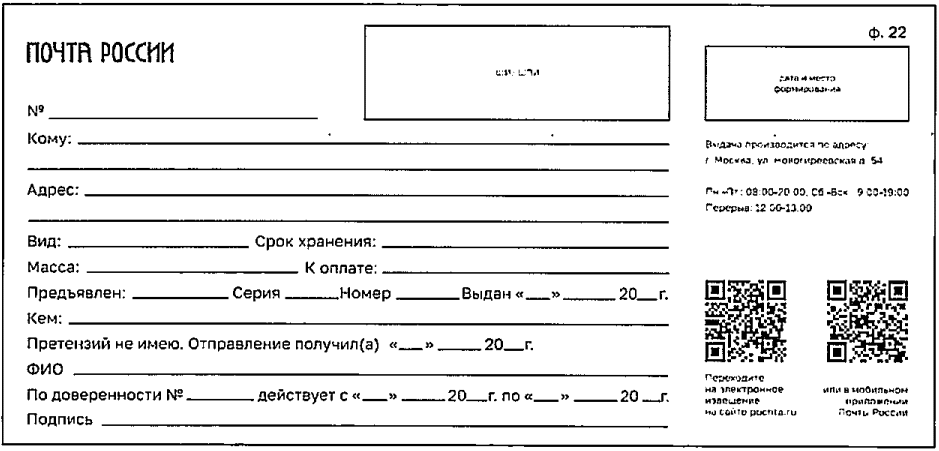 ф. 22/119 на поступившие почтовые отправления адресатам, находящимся вне поселений (в домах путевых обходчиков железных дорог, лесных сторожках, метеостанциях и т.д.), или их уполномоченным представителям осуществляется в отделениях почтовой связи на основе договоров, заключаемых с такими адресатами.