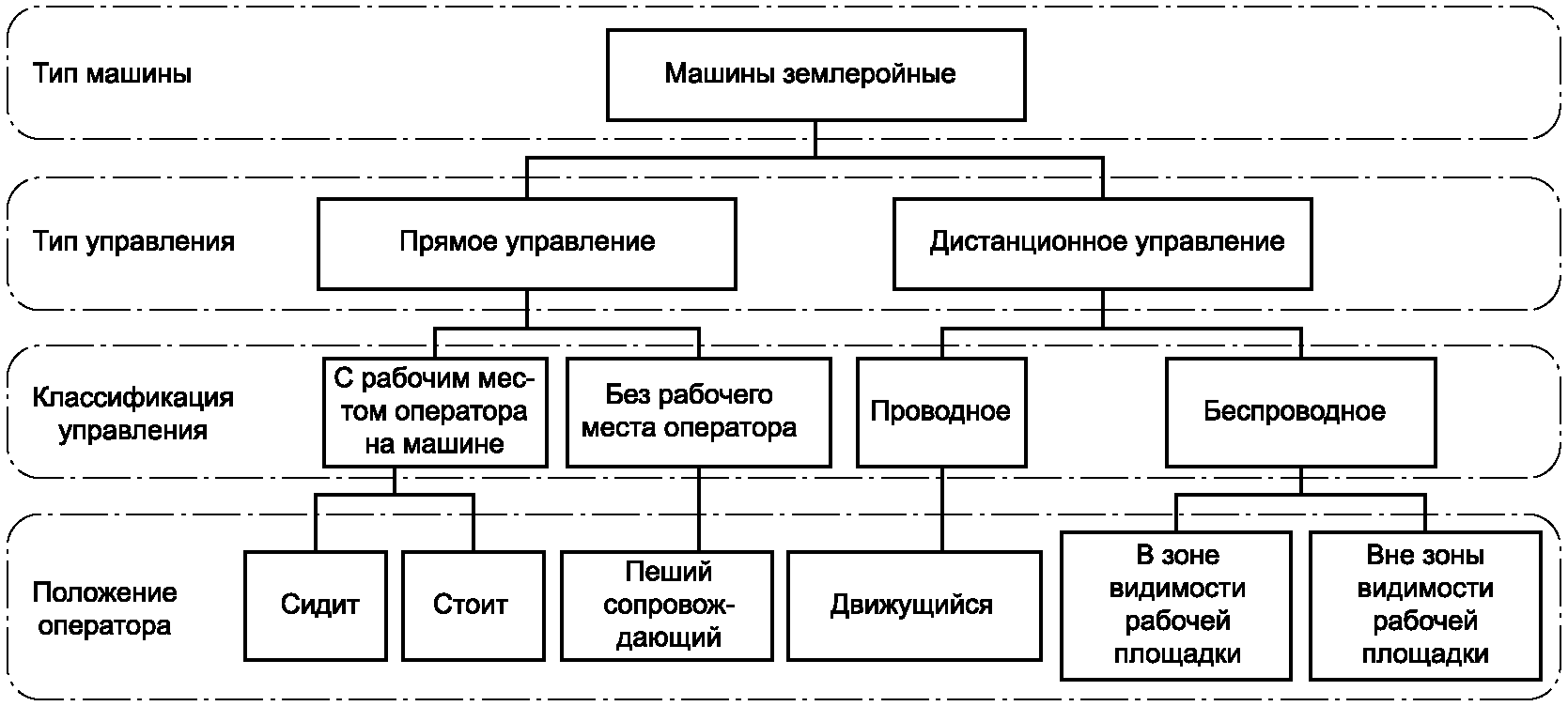 Конфигурация органов управления землеройных машин может быть представлена в виде иерархической структуры в соответствии с типом управления, классификацией управления и положением оператора, как показано на