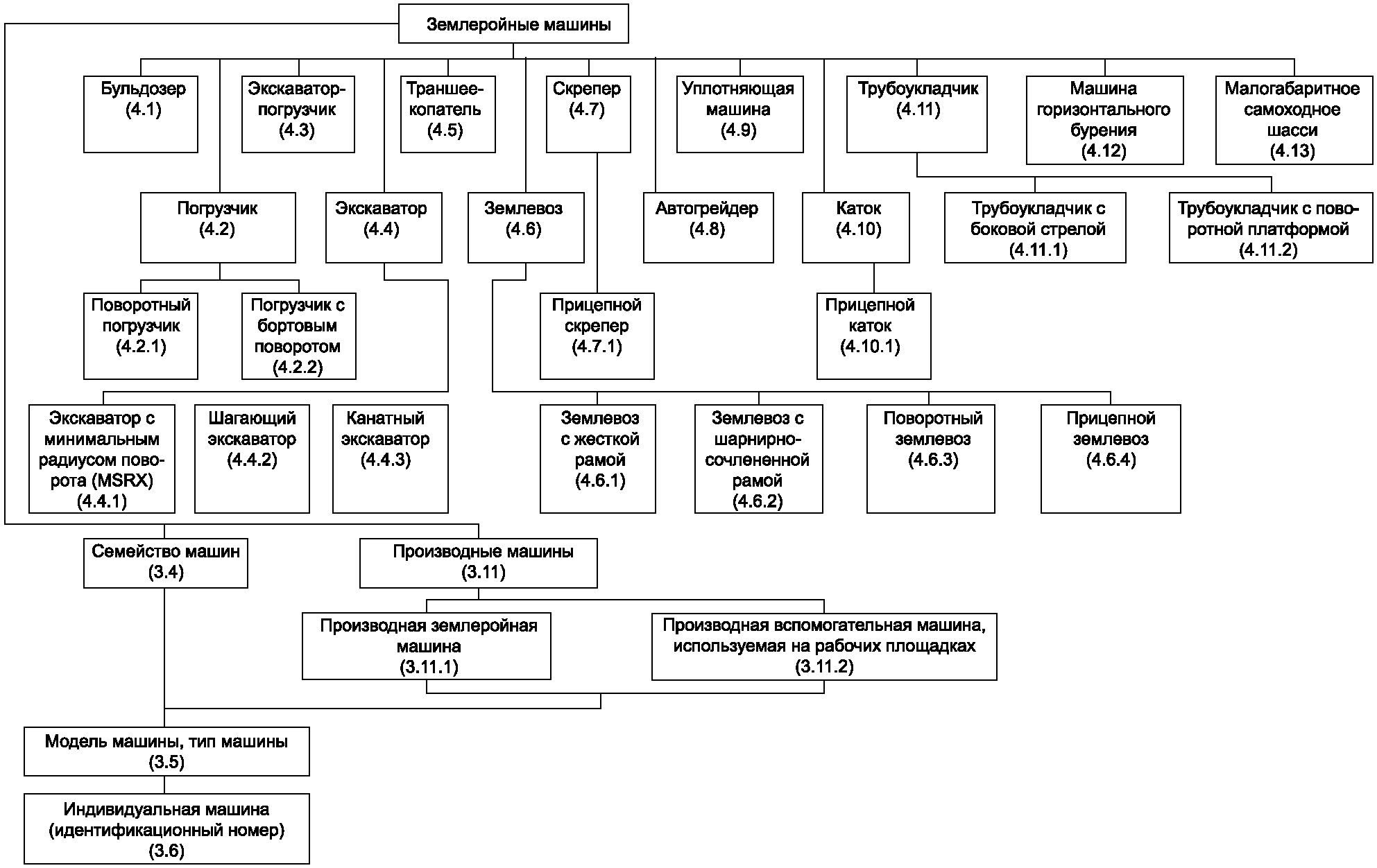 В целом землеройные машины могут быть идентифицированы посредством объединения технических требований по каждой из характеристик, приведенных выше. Это позволяет однозначно идентифицировать машины, не определенные явно в настоящем стандарте, при условии, что они относятся к одному из имеющихся семейств машин.