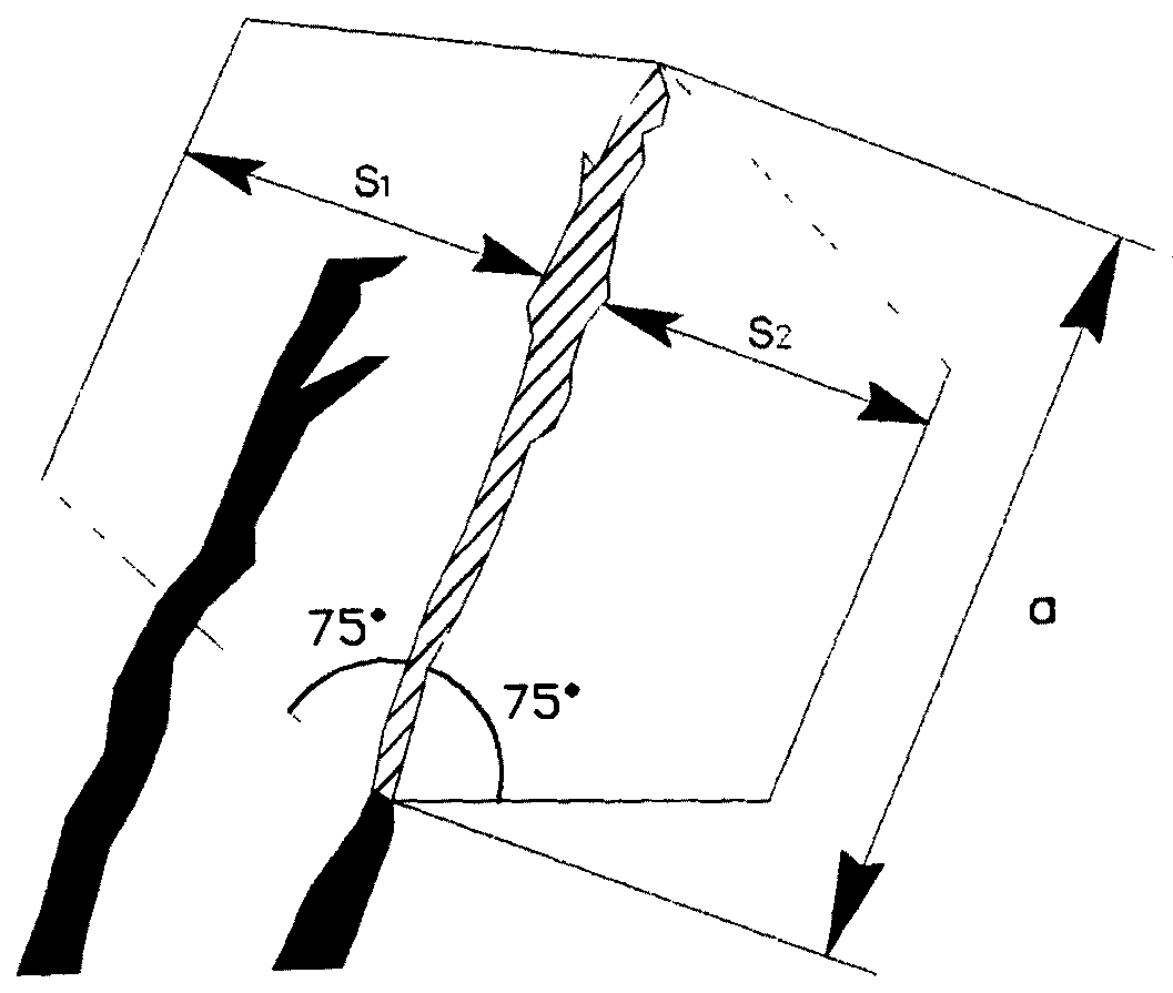 При оценке напряженности блоковых структур, имеющих морфологию тектонического шва, в форме сглаженной и плотно сомкнутой поверхности скважины бурятся с пересечением тектонического нарушения. При этом забой скважины в смежном блоке должен располагаться от плоскости тектонического нарушения на расстоянии не менее 15 м. При оценке напряженности блоковых структур, имеющих морфологию тектонического шва с зонами дробления, скважины бурятся без пересечения плоскости тектонического нарушения. При этом забои скважин в смежных блоках должны располагаться от плоскоскости тектонического нарушения на расстоянии не более 10 м. Величина показателя