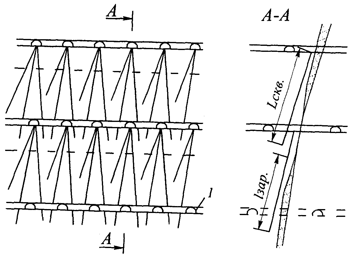 Камуфлетное взрывание по рядам и пучкам скважин необходимо для снижения тектонических напряжений на участках, опасных по горно-тектоническим ударам, по типовой схеме, приведенной на рисунке 14.
