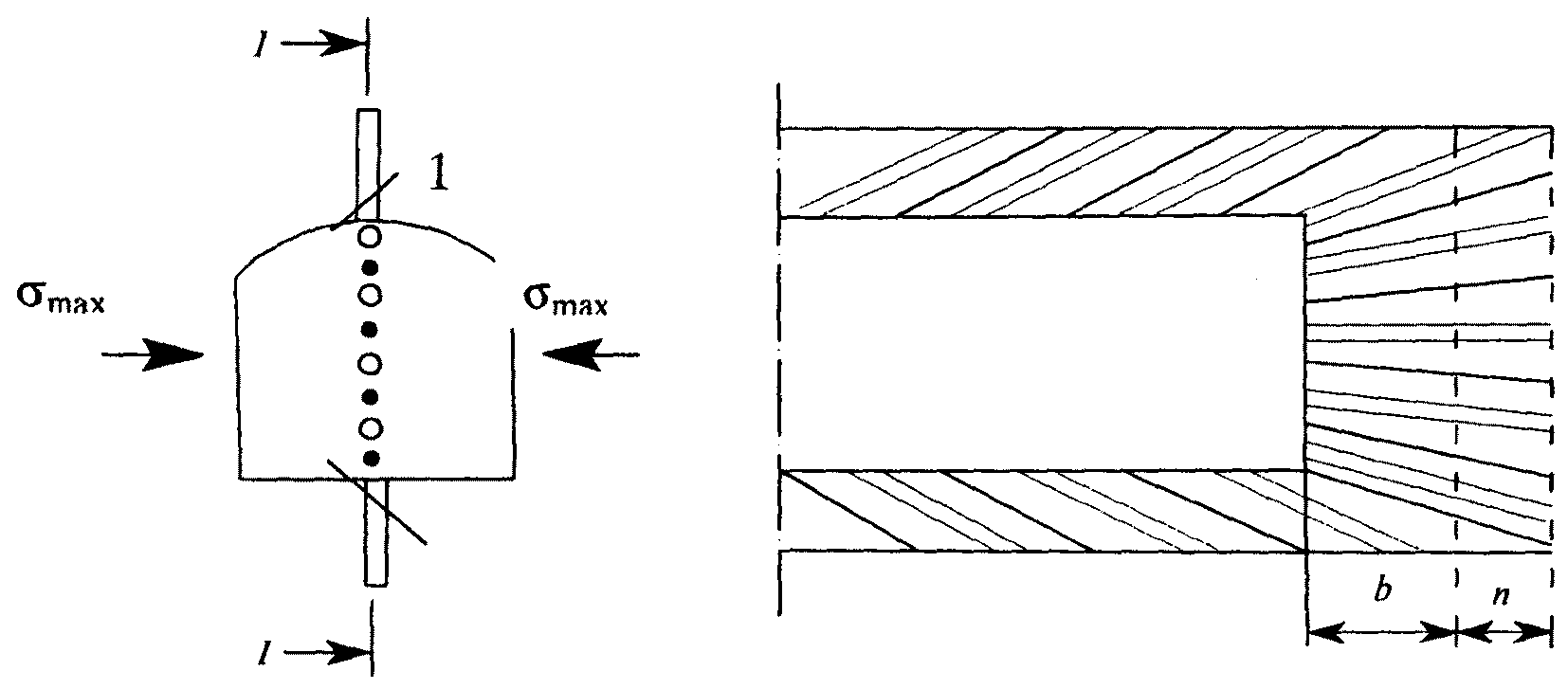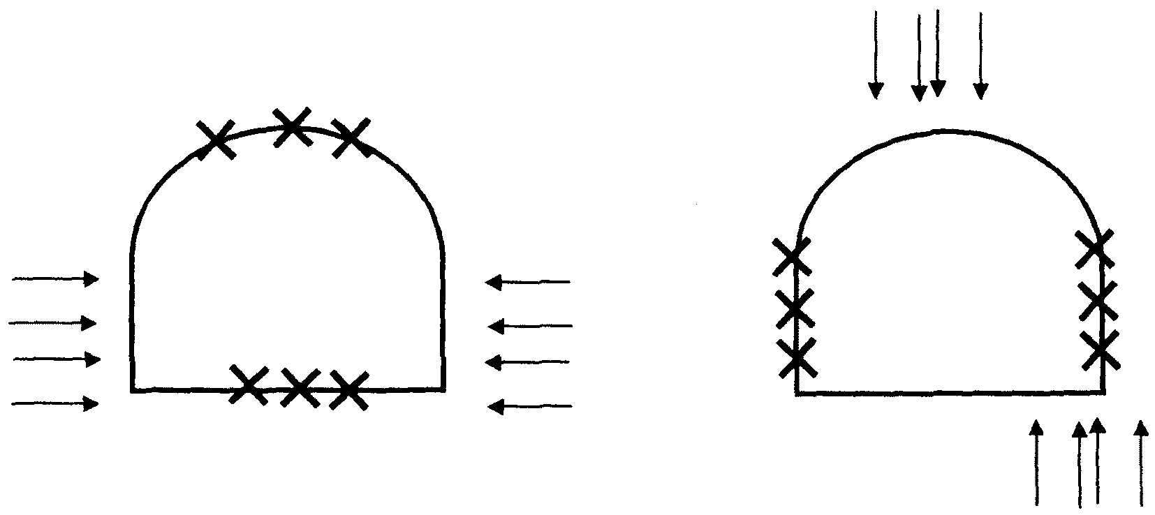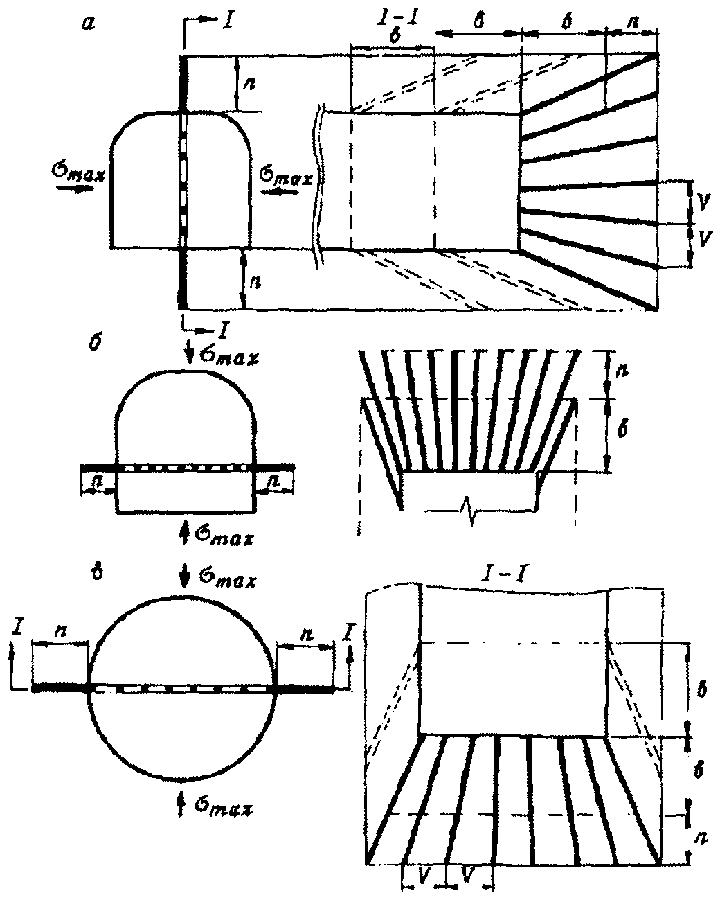 По визуальным наблюдениям можно сравнивать степень напряженности отдельных конструктивных элементов системы разработки и ориентировочно определять величину и направление действия наибольших напряжений в нетронутом массиве пород. Ориентировка участков разрушения пород в сечении выработки относительно наибольших сжимающих напряжений изображена на рисунке 10.