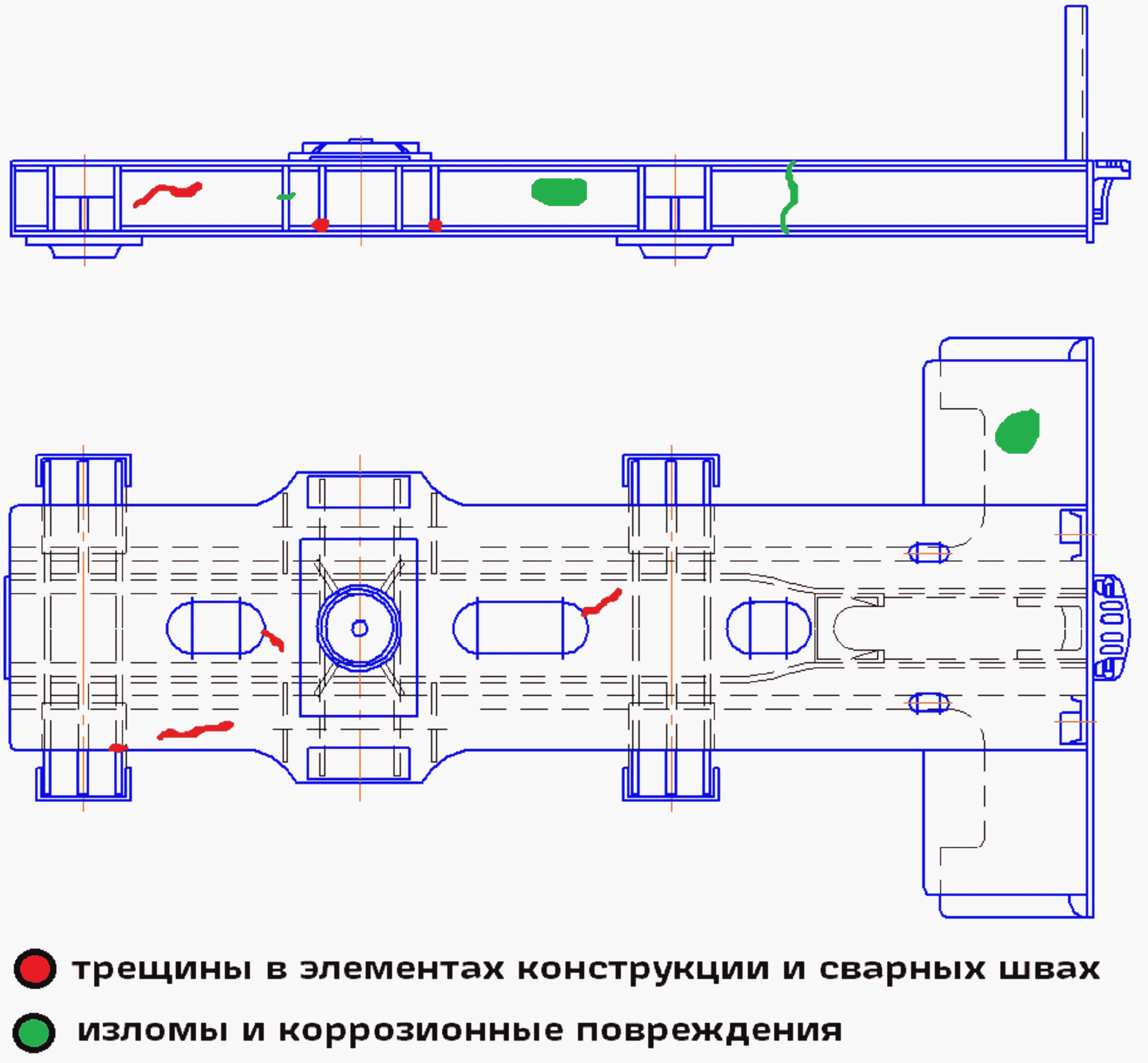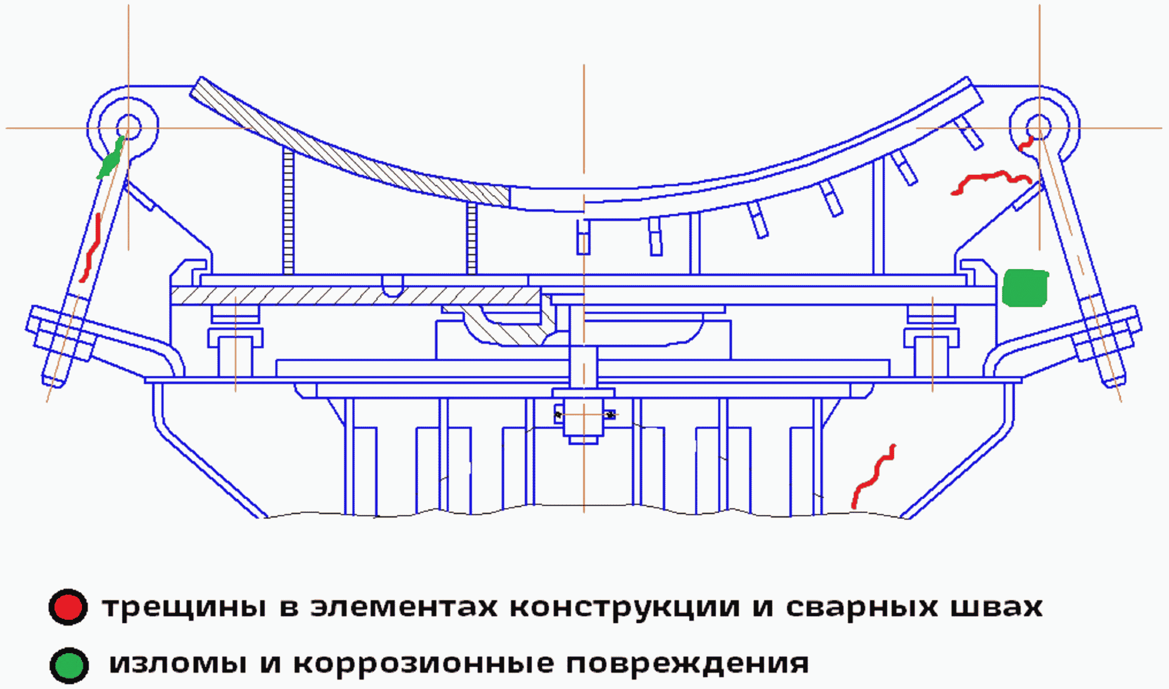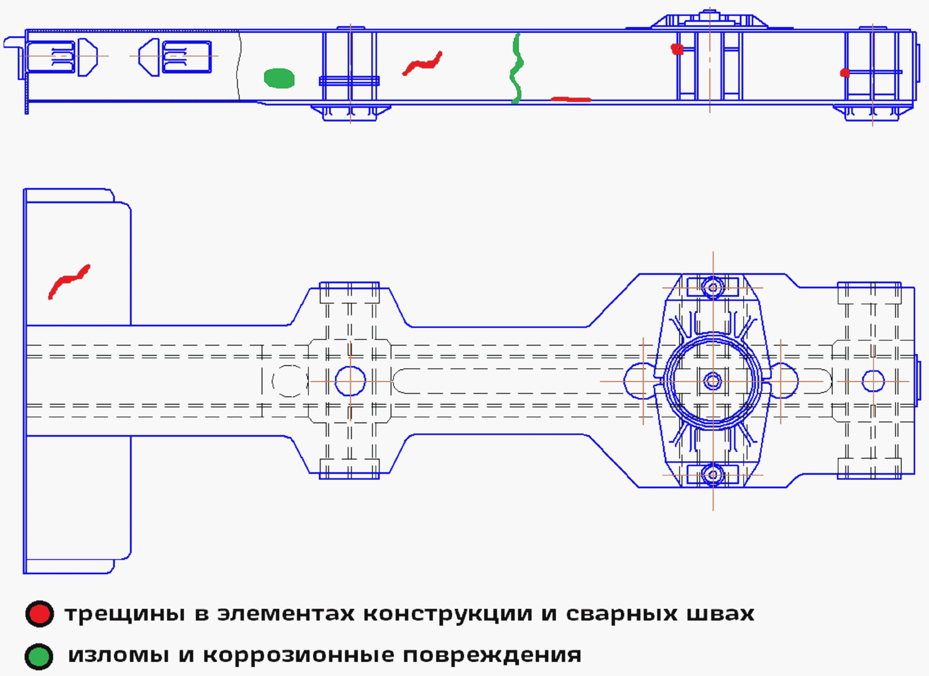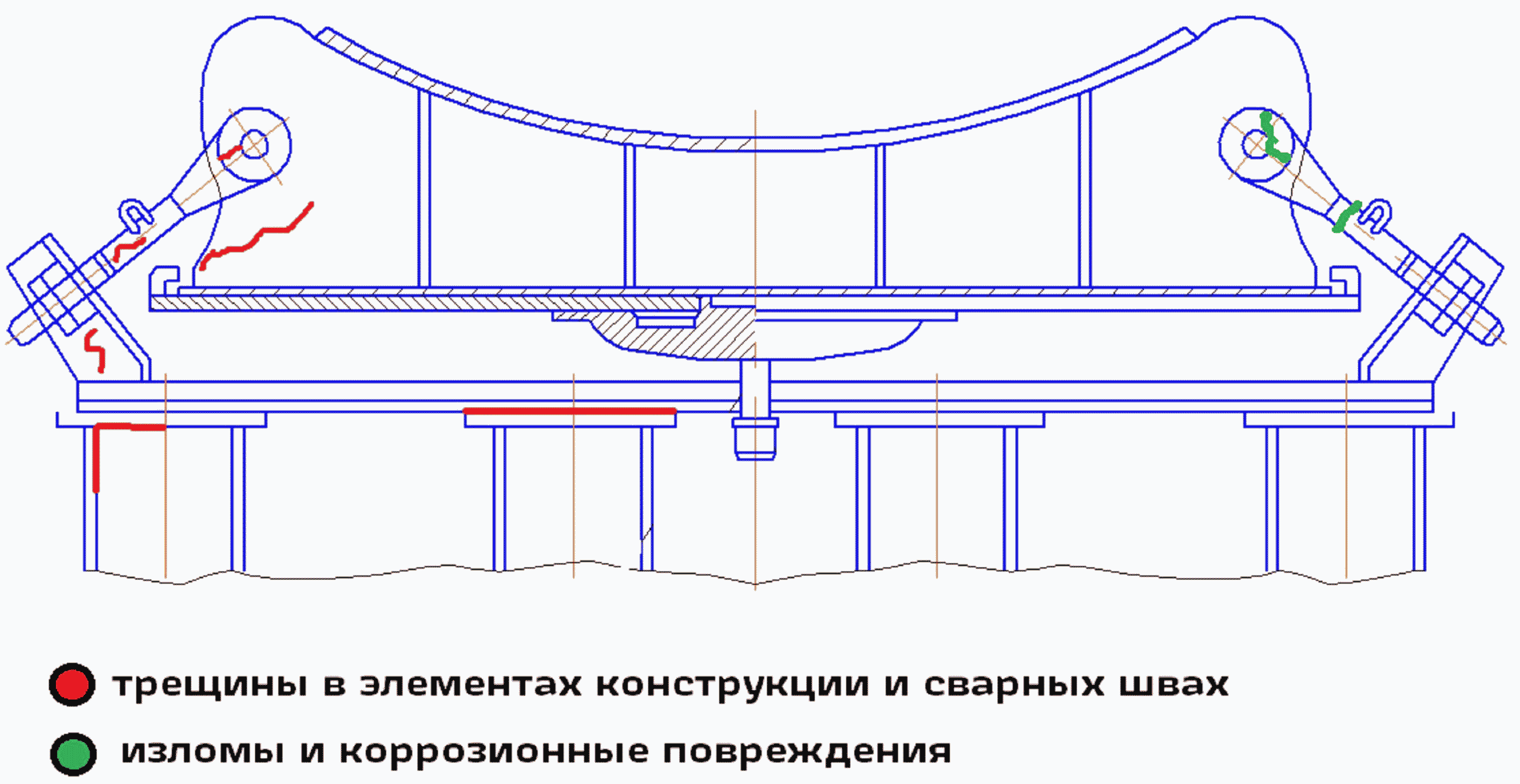 9.8 Водила (балок коробчатого сечения, шарниров крепления балок к несущим консолям и с гидравлическими цилиндрами амортизирующего устройства консолей, вертикальной направляющей балки) | + | + | + | + | + |