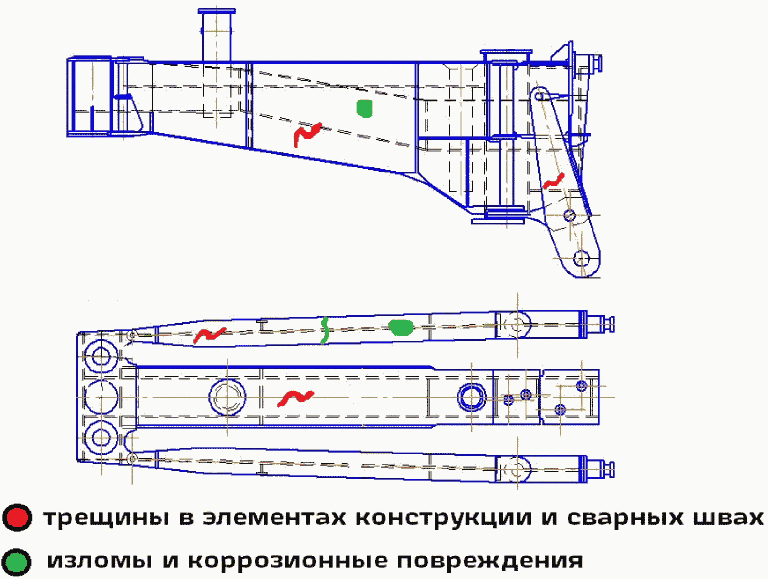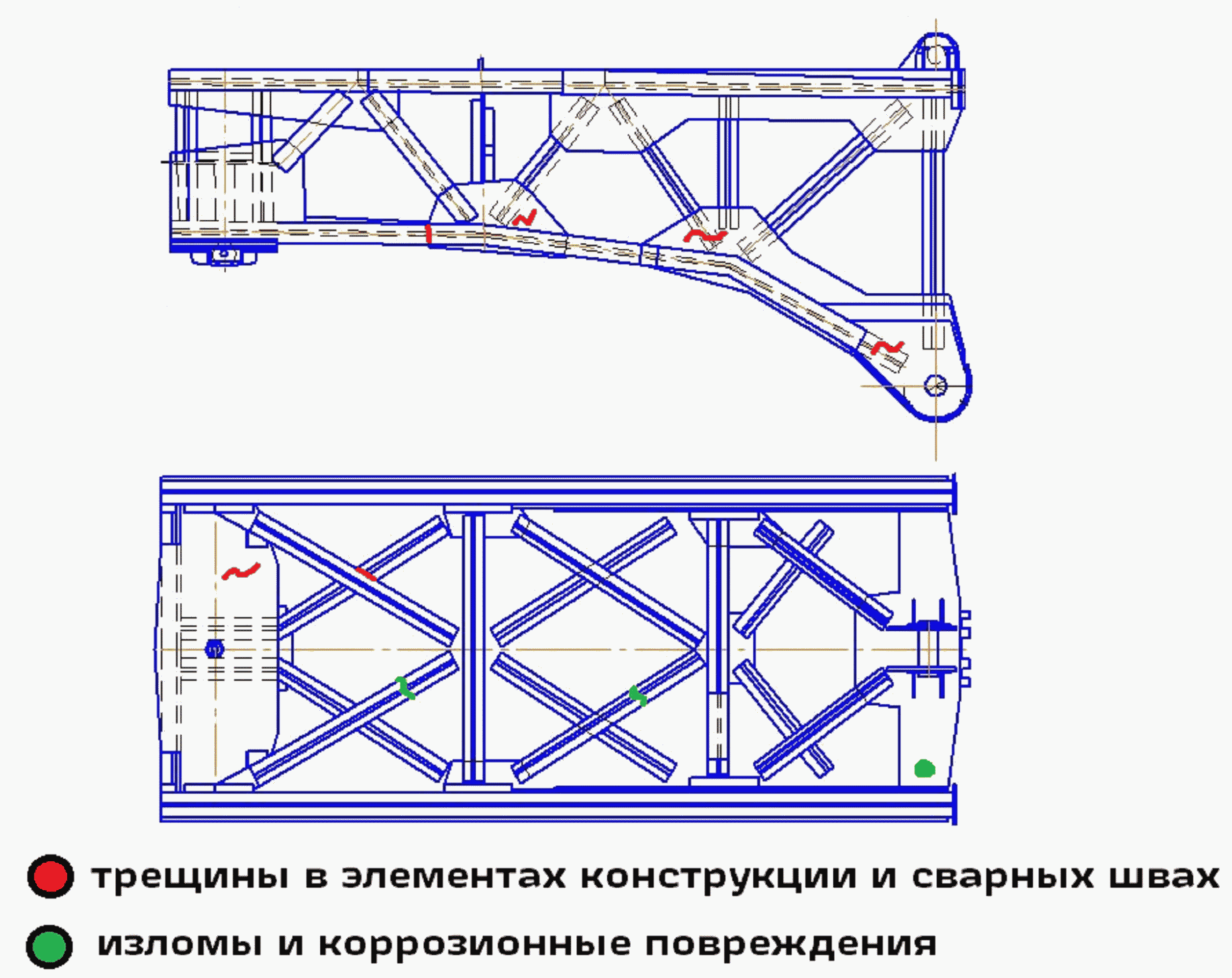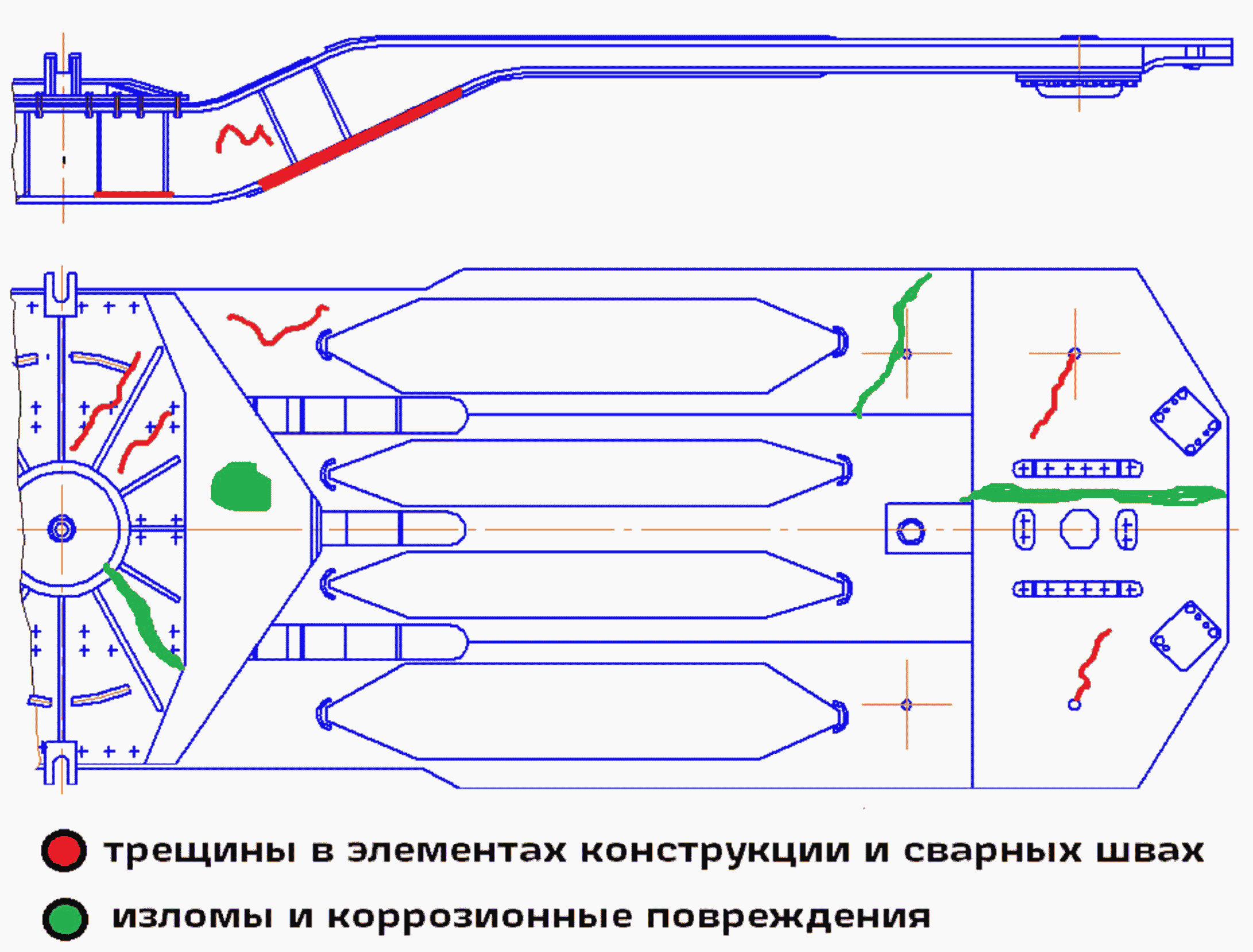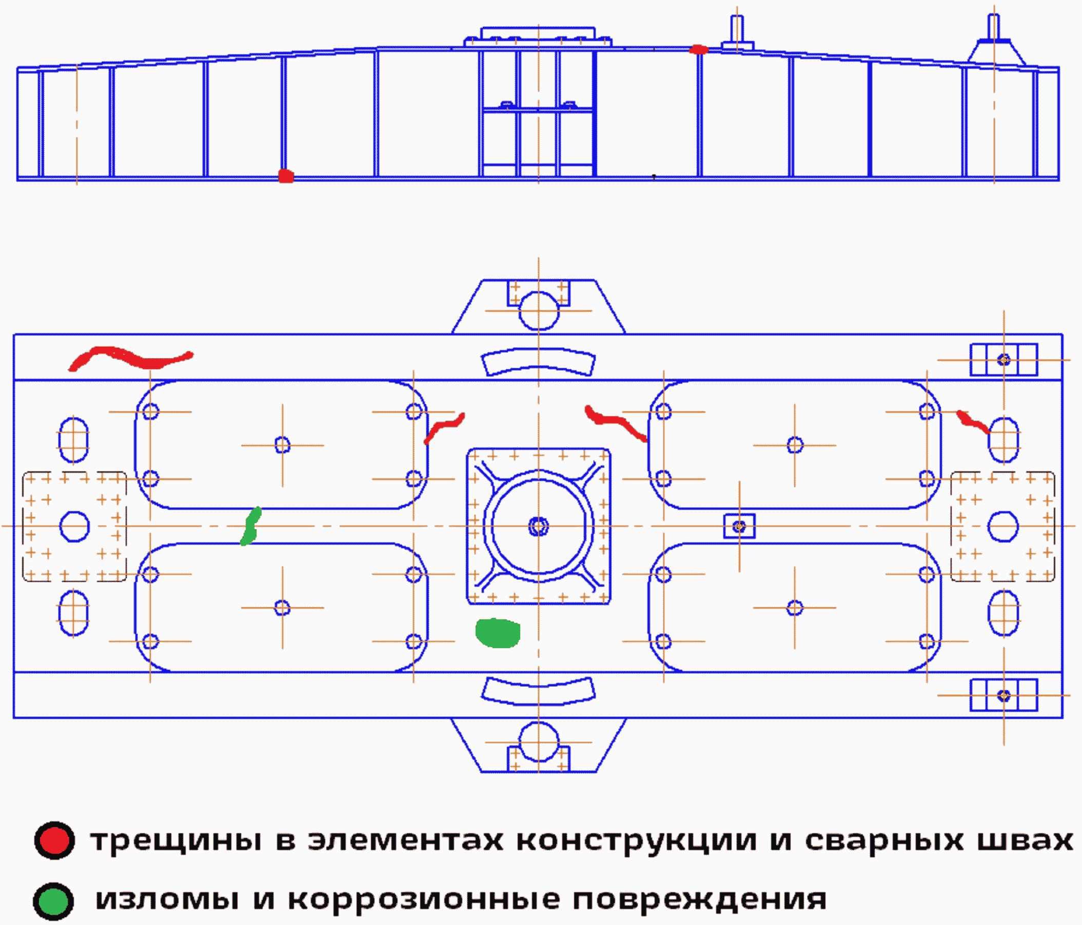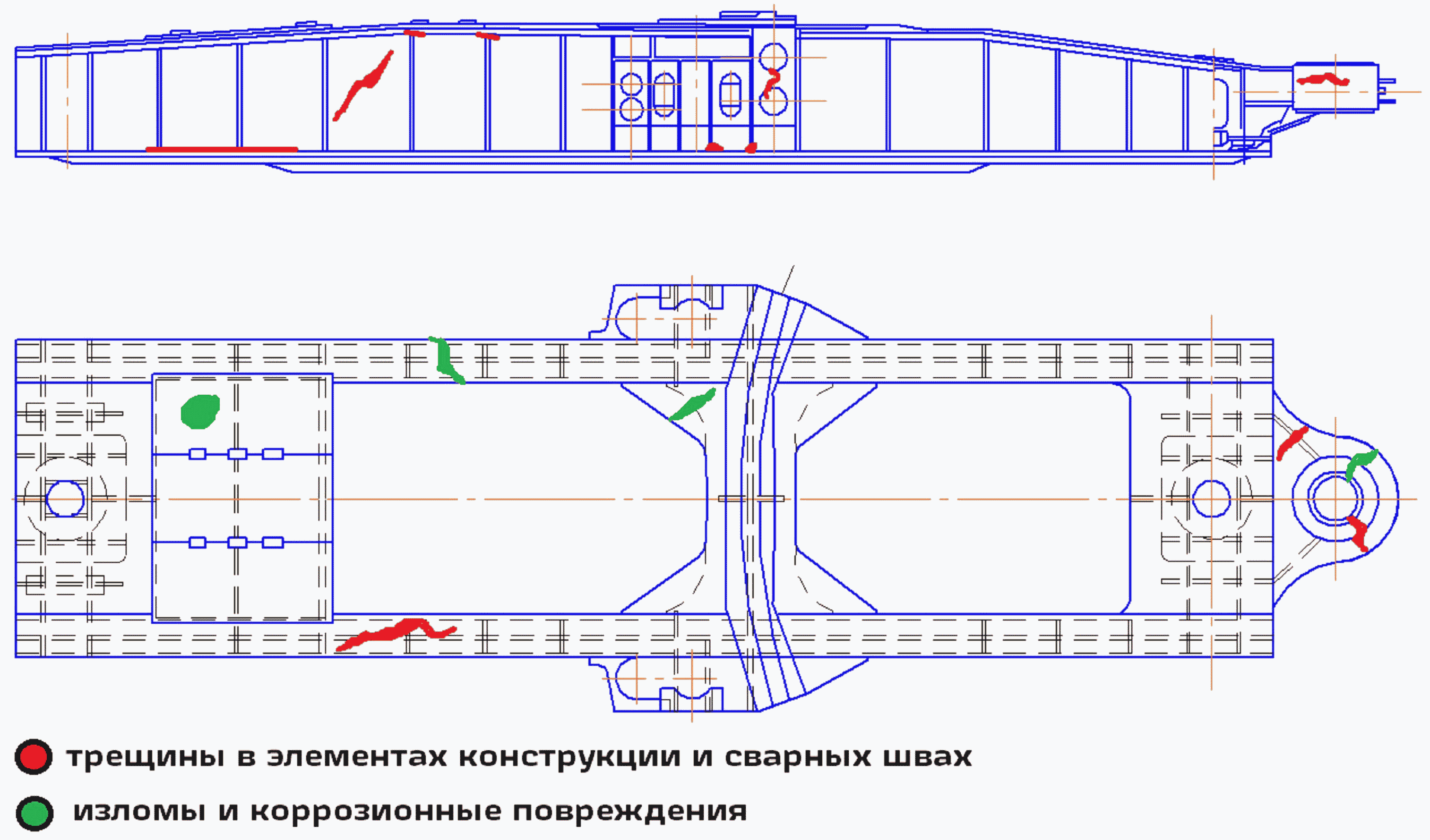 9.8 Водила (балок коробчатого сечения, шарниров крепления балок к несущим консолям и с гидравлическими цилиндрами амортизирующего устройства консолей, вертикальной направляющей балки) | + | + | + | + | + |