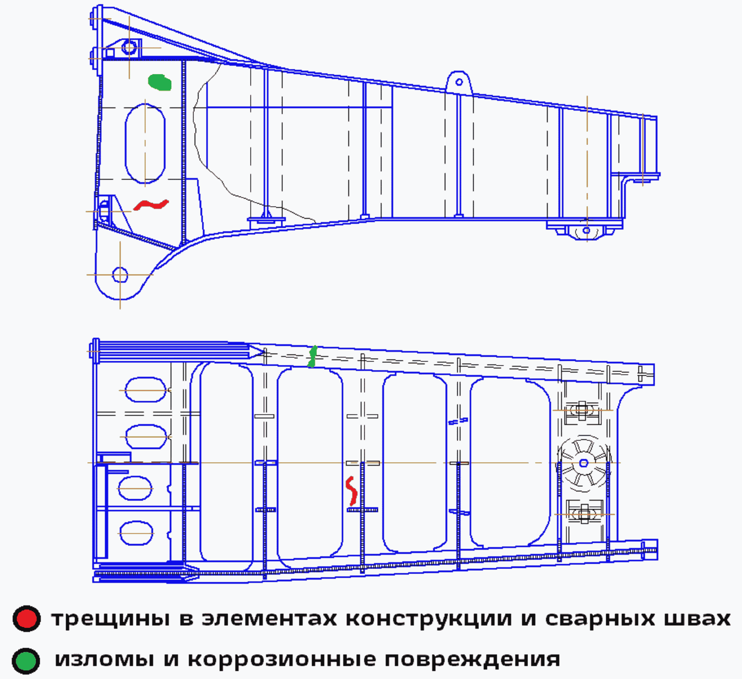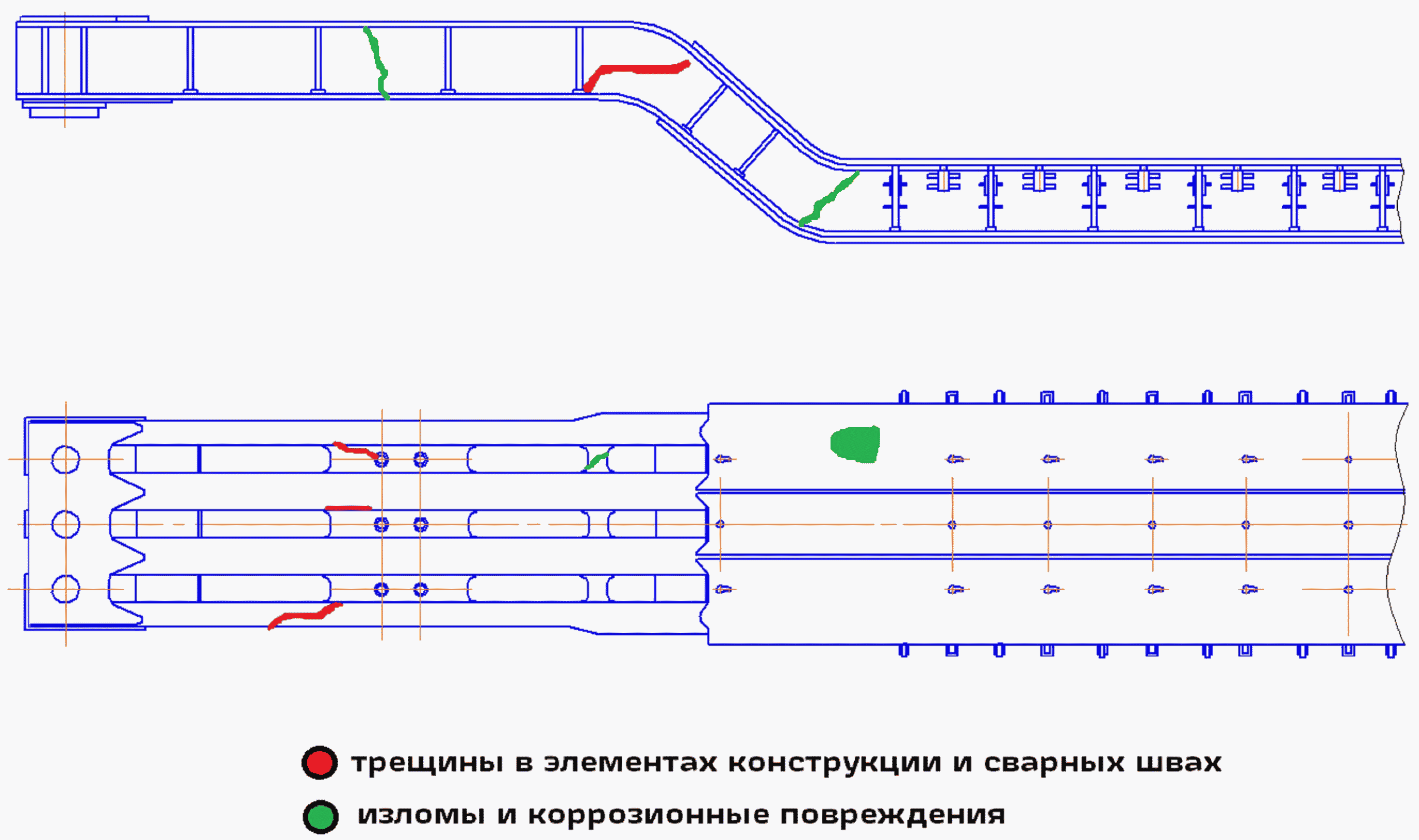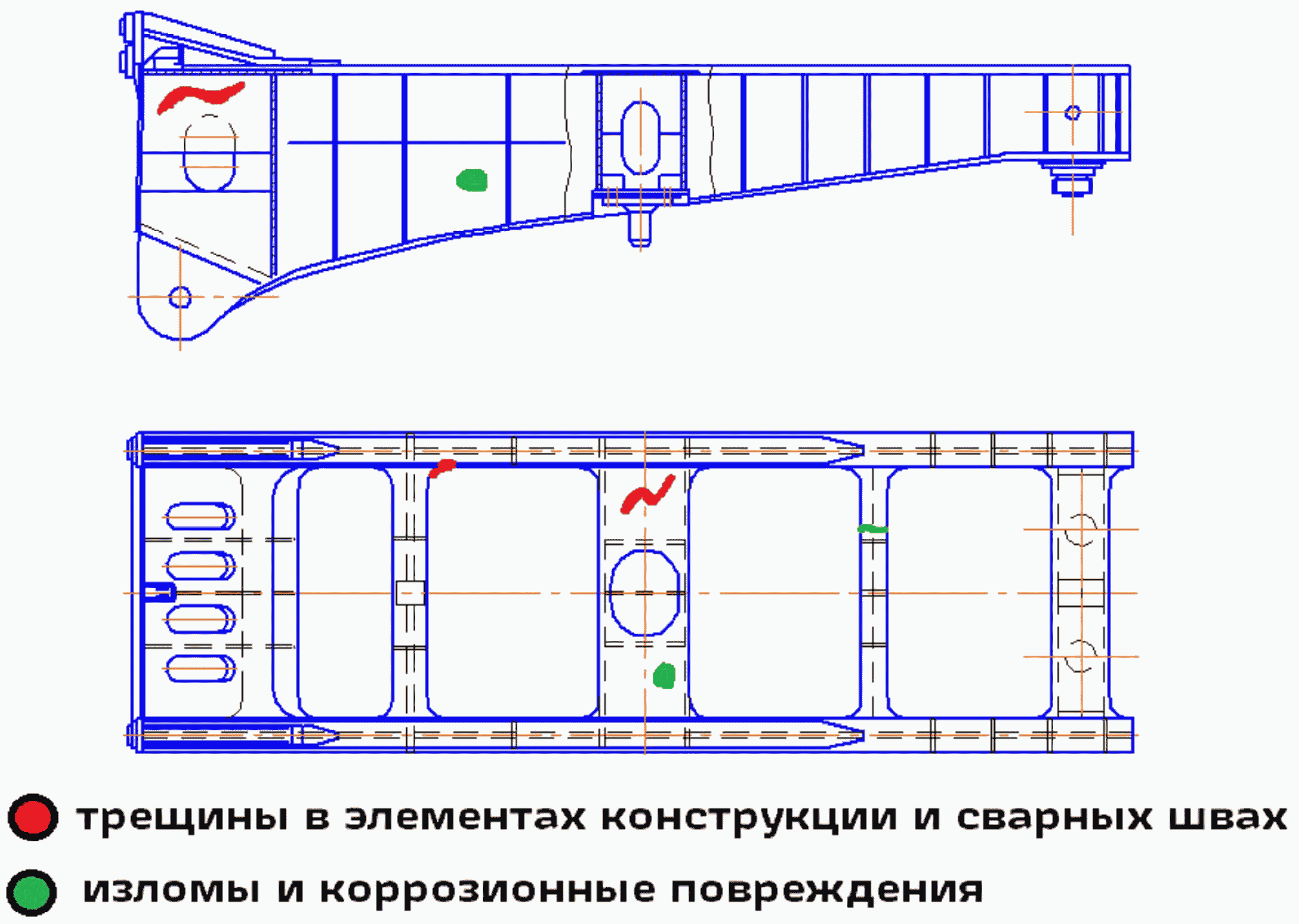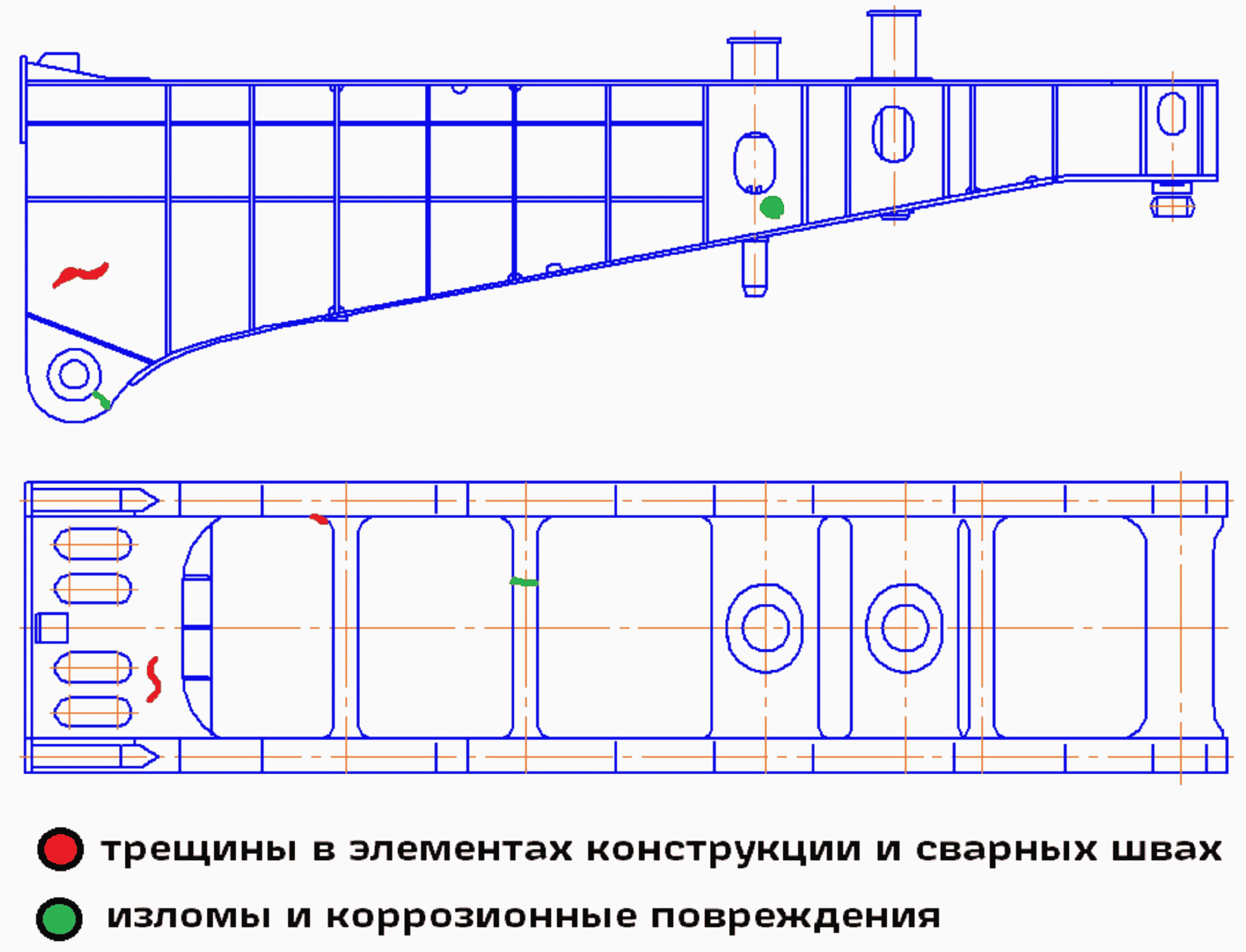 9.8 Водила (балок коробчатого сечения, шарниров крепления балок к несущим консолям и с гидравлическими цилиндрами амортизирующего устройства консолей, вертикальной направляющей балки) | + | + | + | + | + |