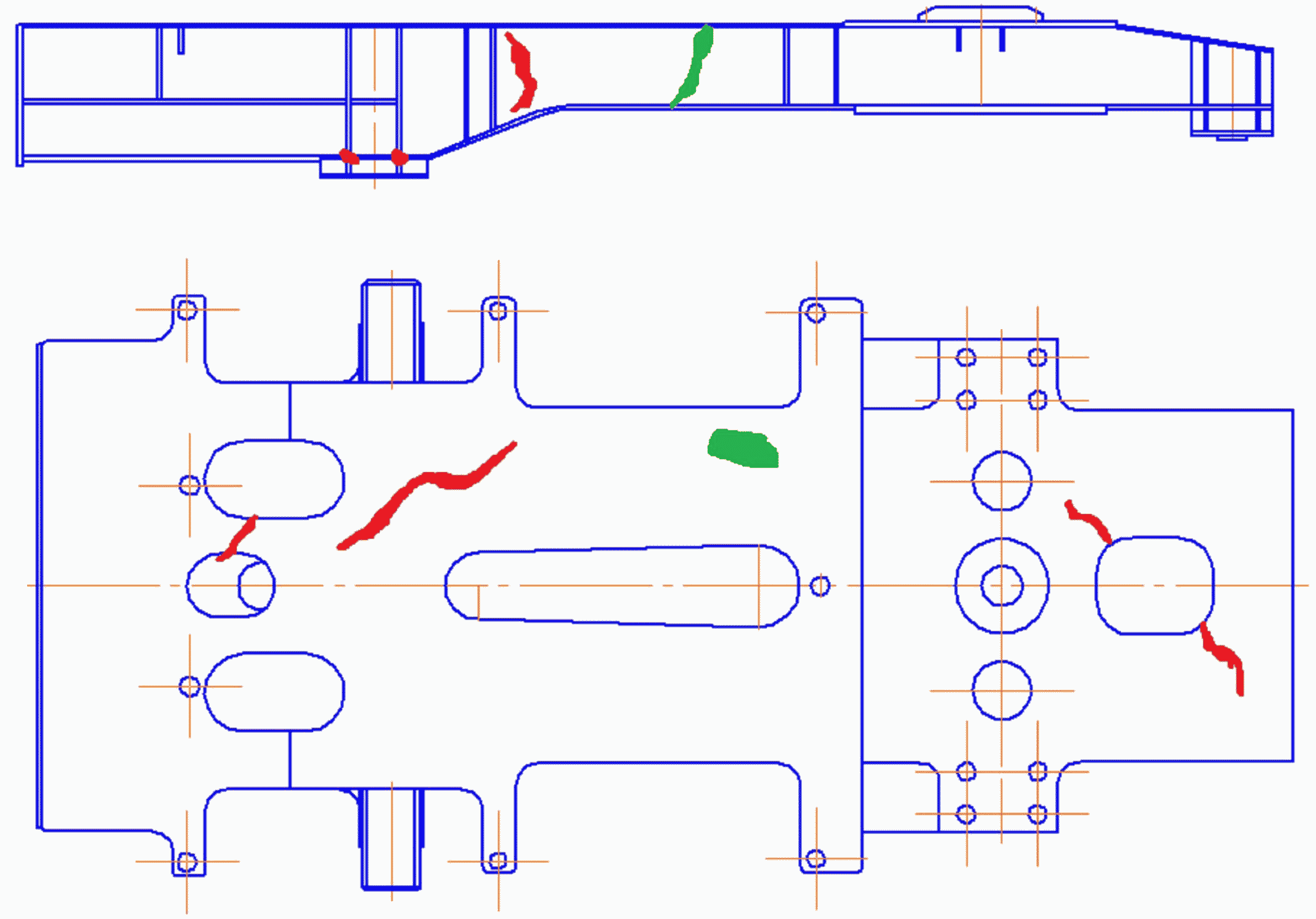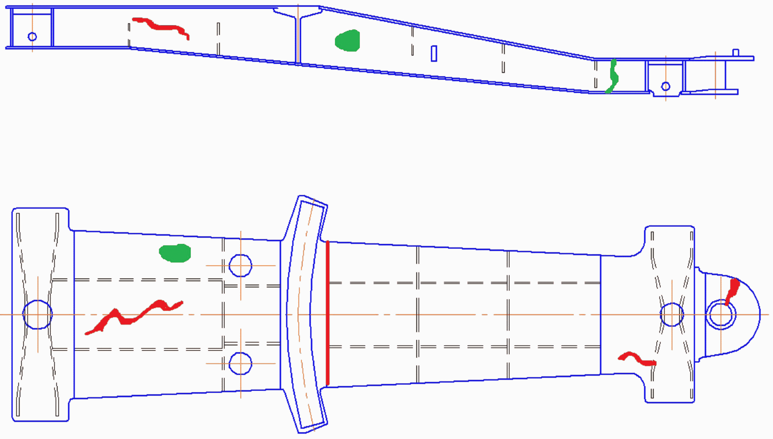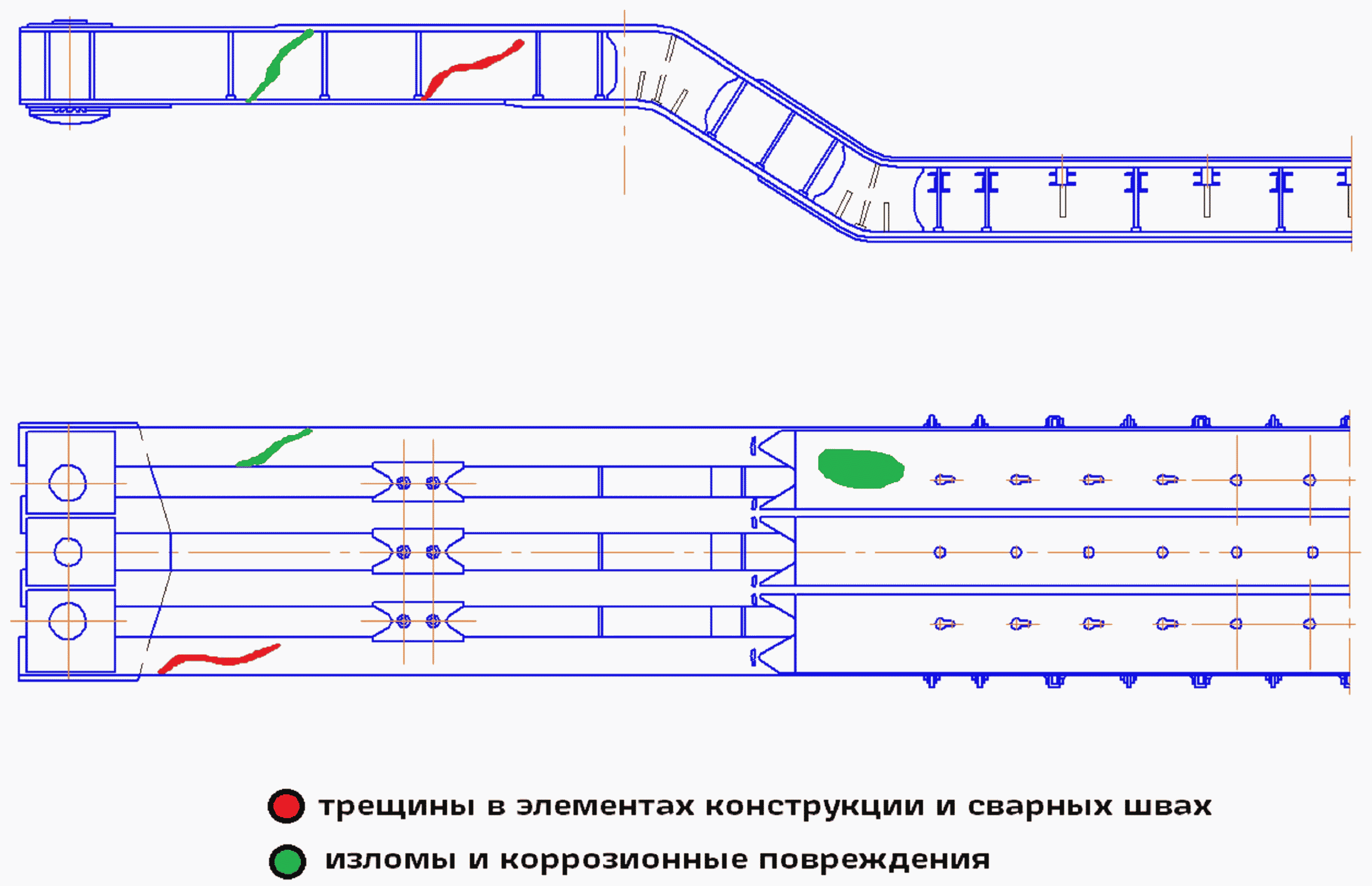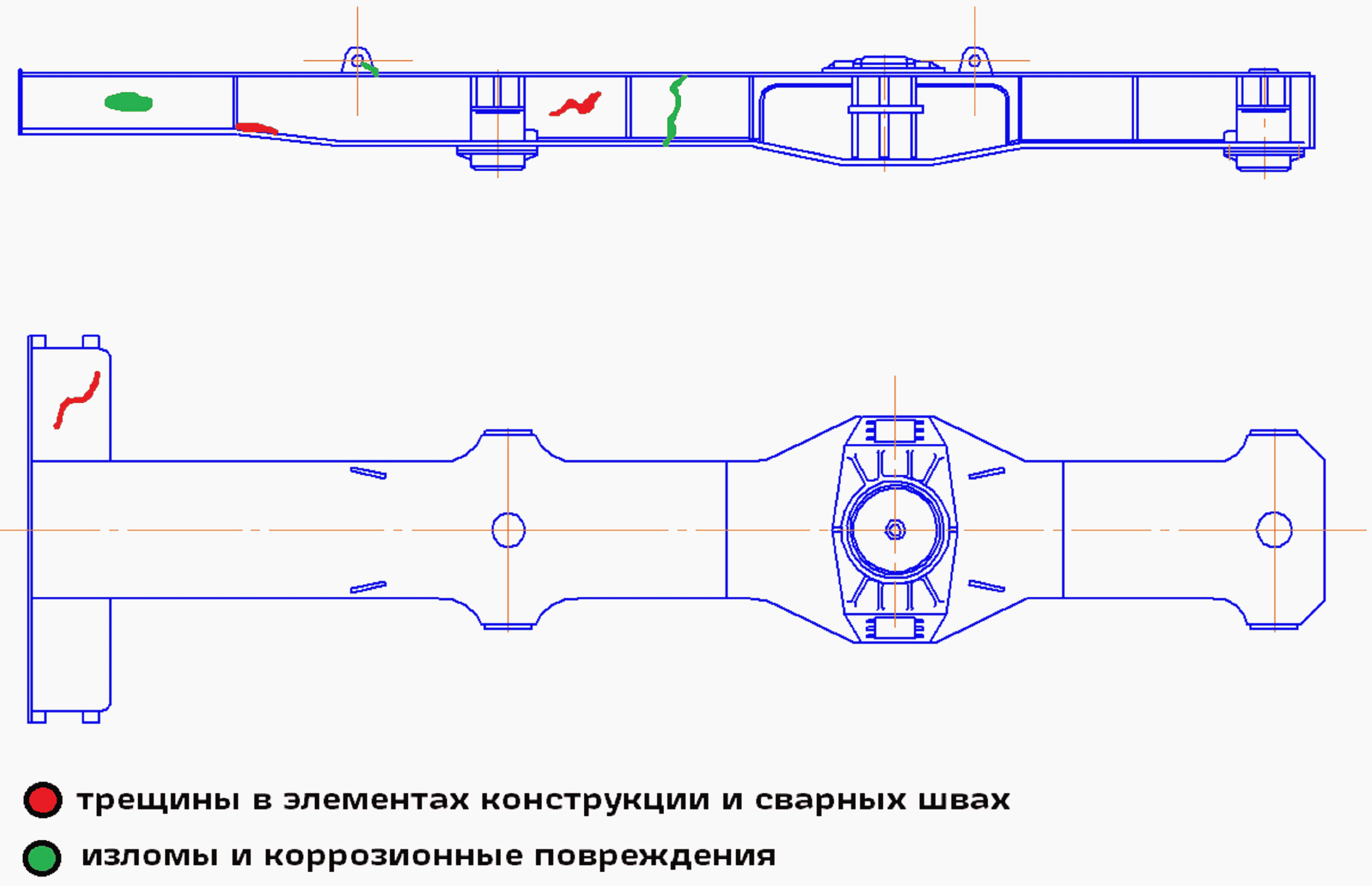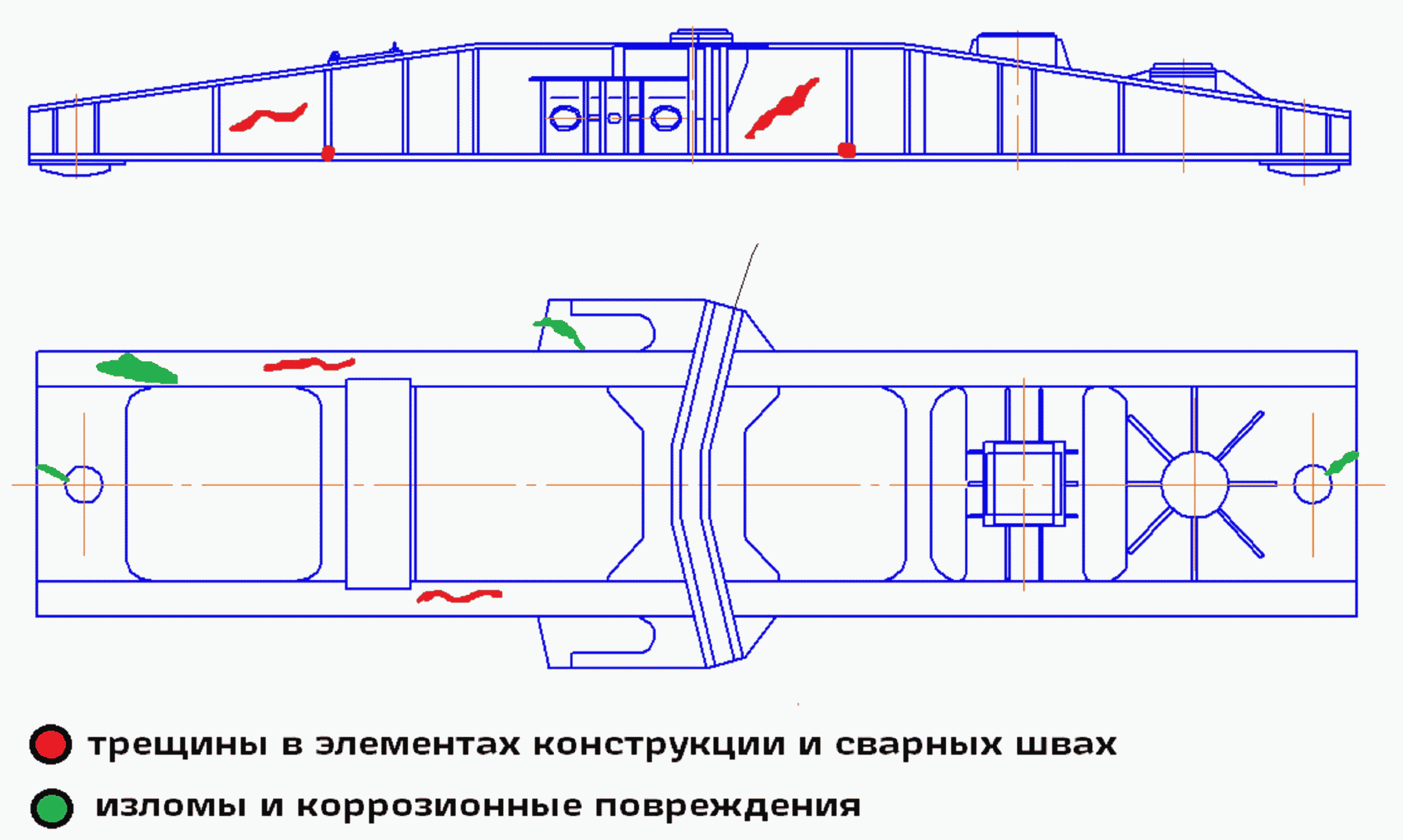 9.8 Водила (балок коробчатого сечения, шарниров крепления балок к несущим консолям и с гидравлическими цилиндрами амортизирующего устройства консолей, вертикальной направляющей балки) | + | + | + | + | + |