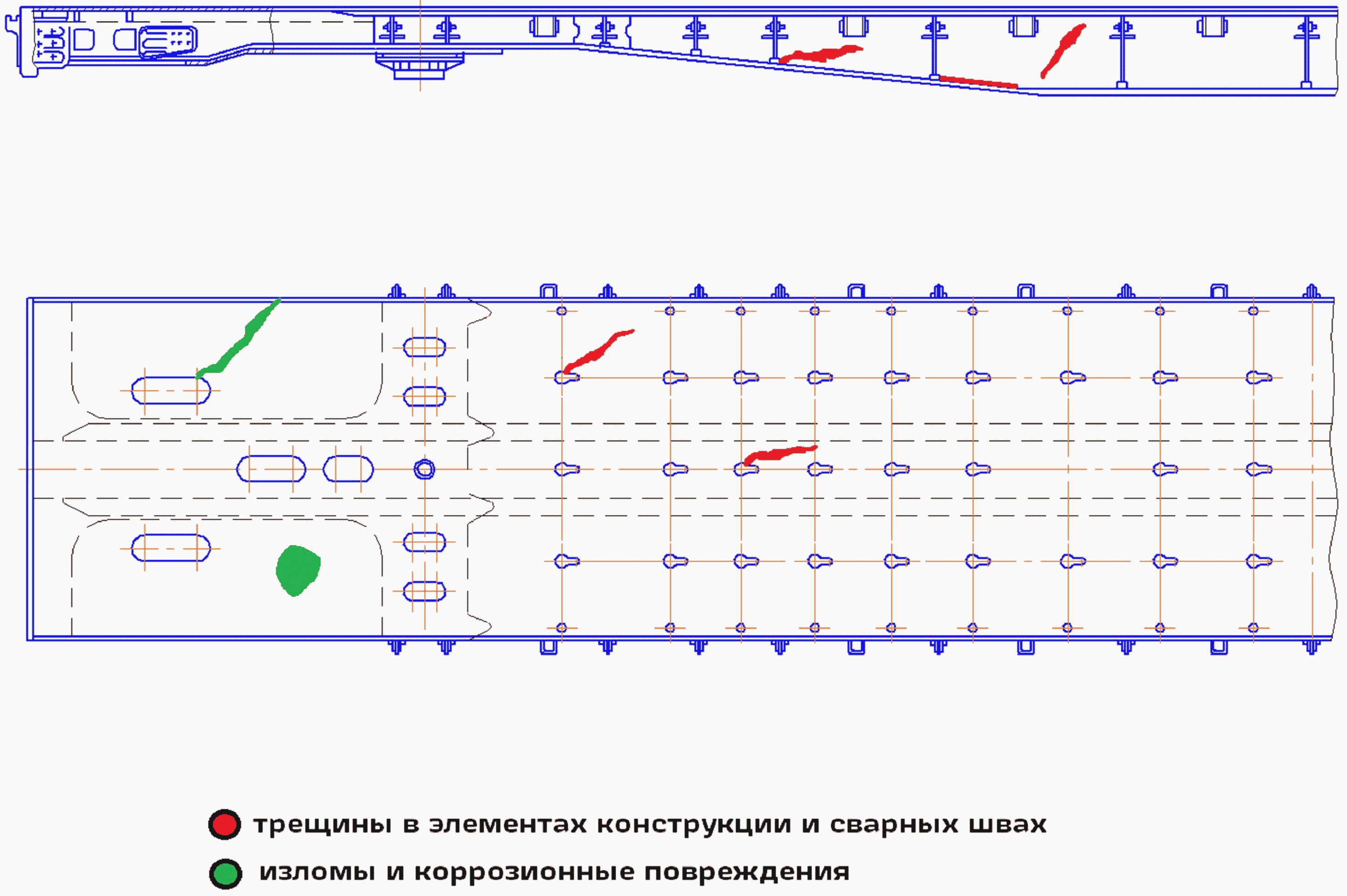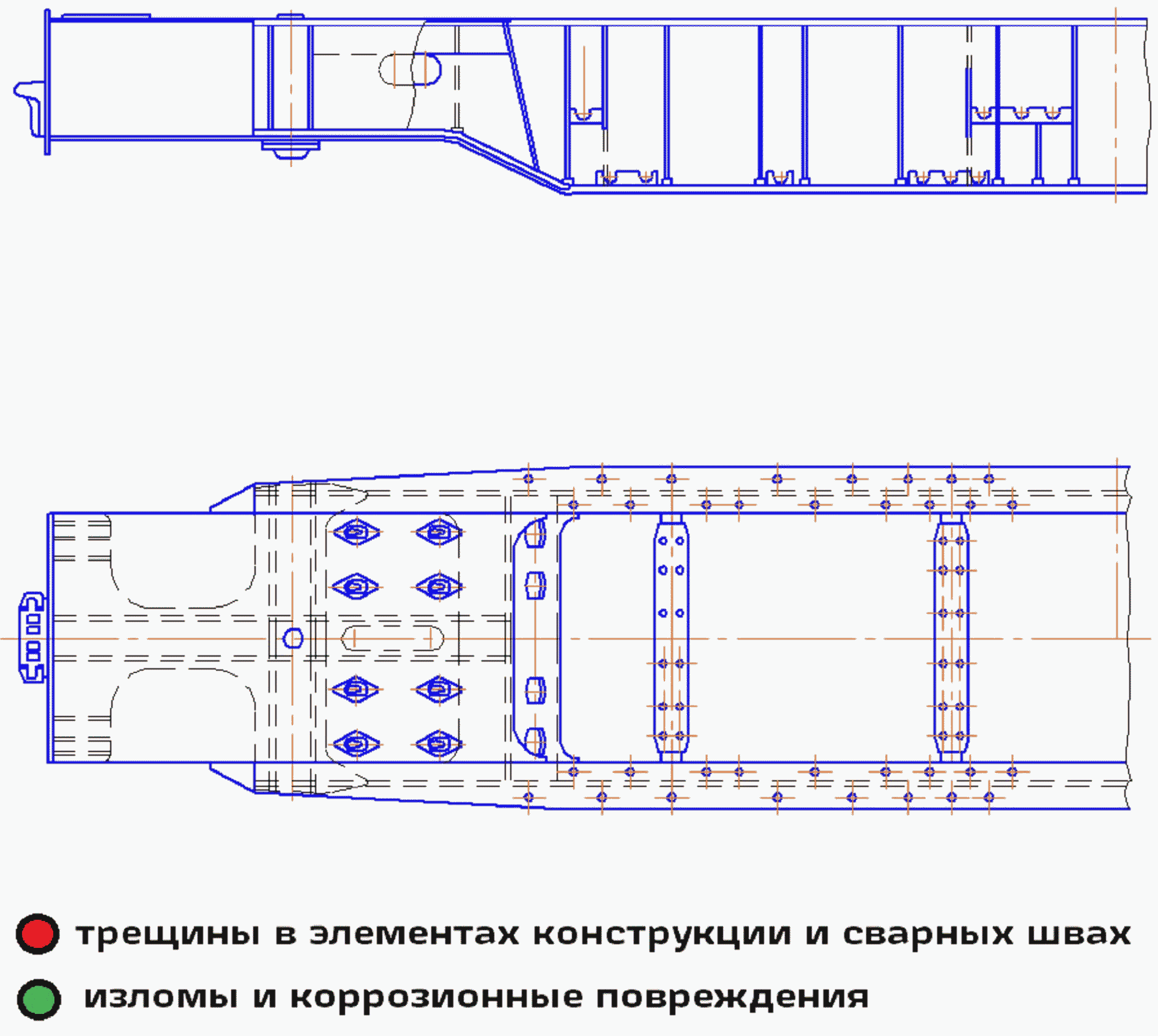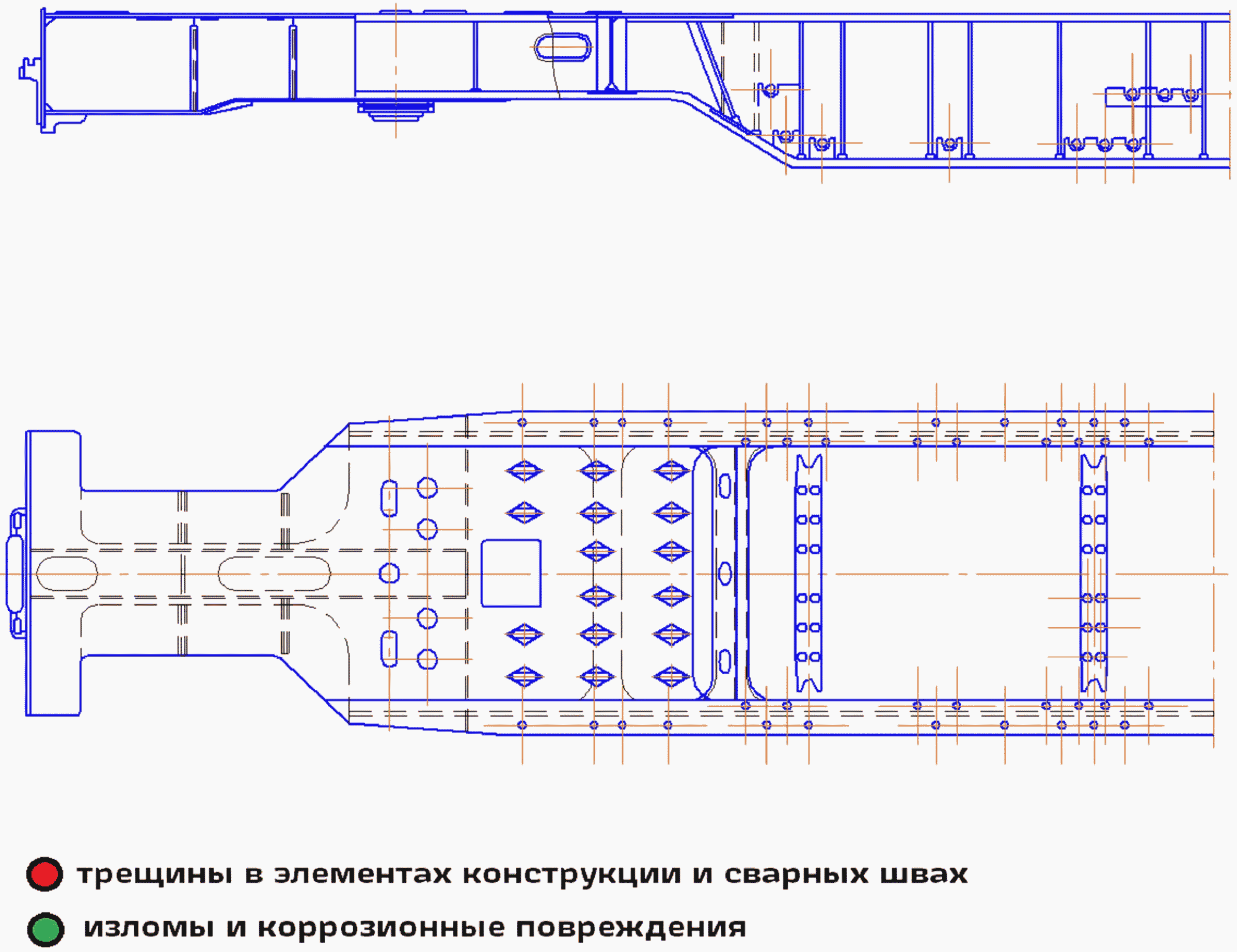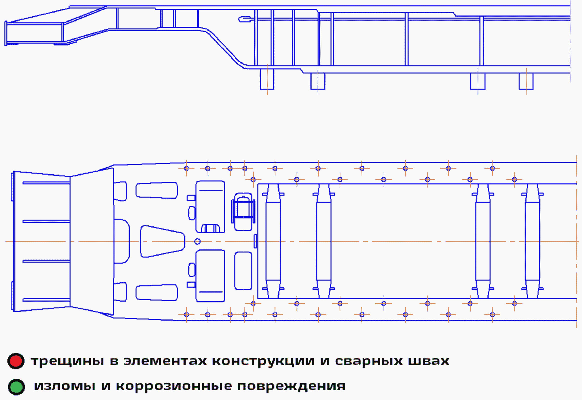 9.4 Направляющего устройства шкворней (шкворней ползунковых рам, роликов, коленчатых рычагов, гидравлических цилиндров, радиальных шарнирных подшипников, упоров, стоек, направляющих планок) | + | + | + | + | + |