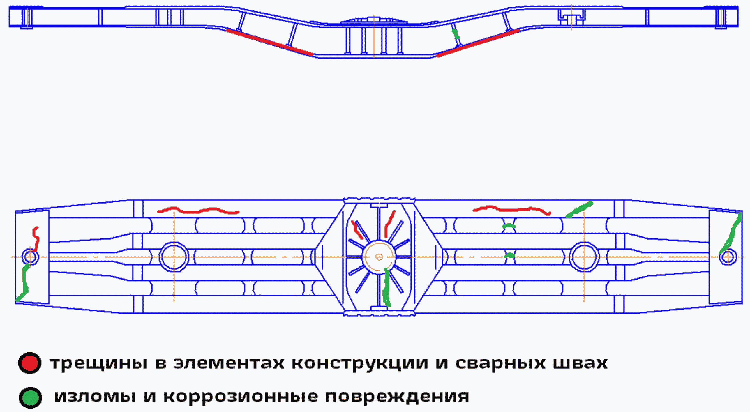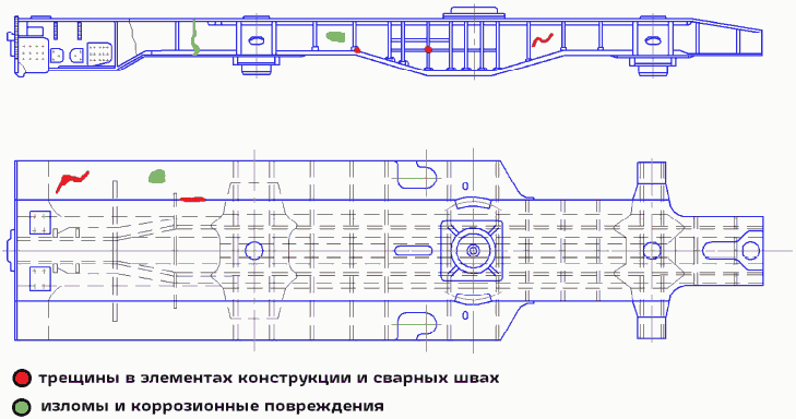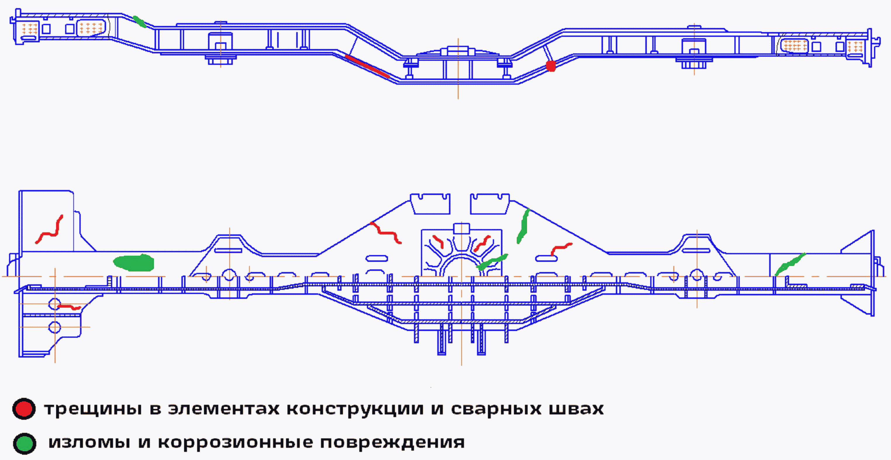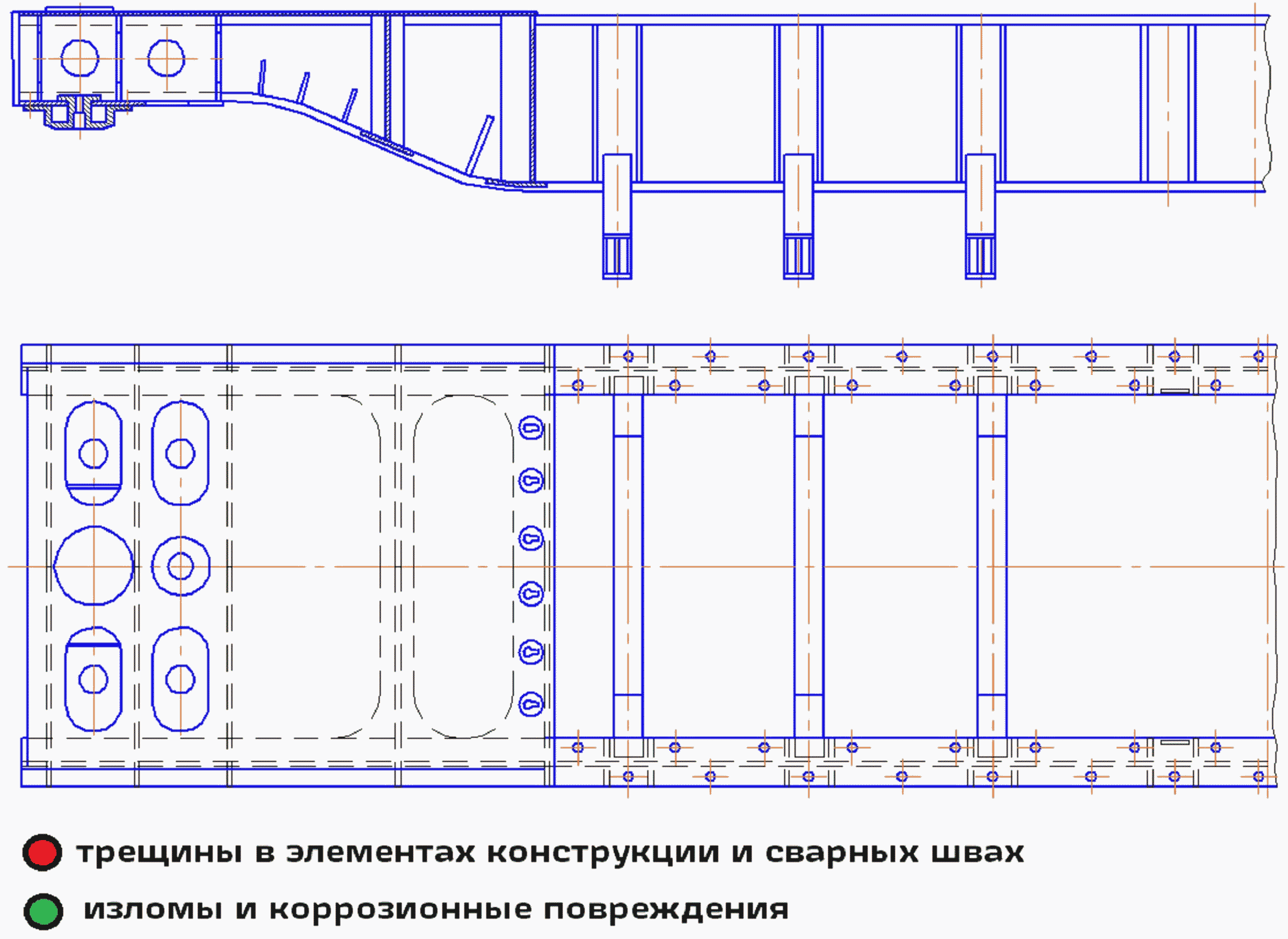 9.4 Направляющего устройства шкворней (шкворней ползунковых рам, роликов, коленчатых рычагов, гидравлических цилиндров, радиальных шарнирных подшипников, упоров, стоек, направляющих планок) | + | + | + | + | + |
