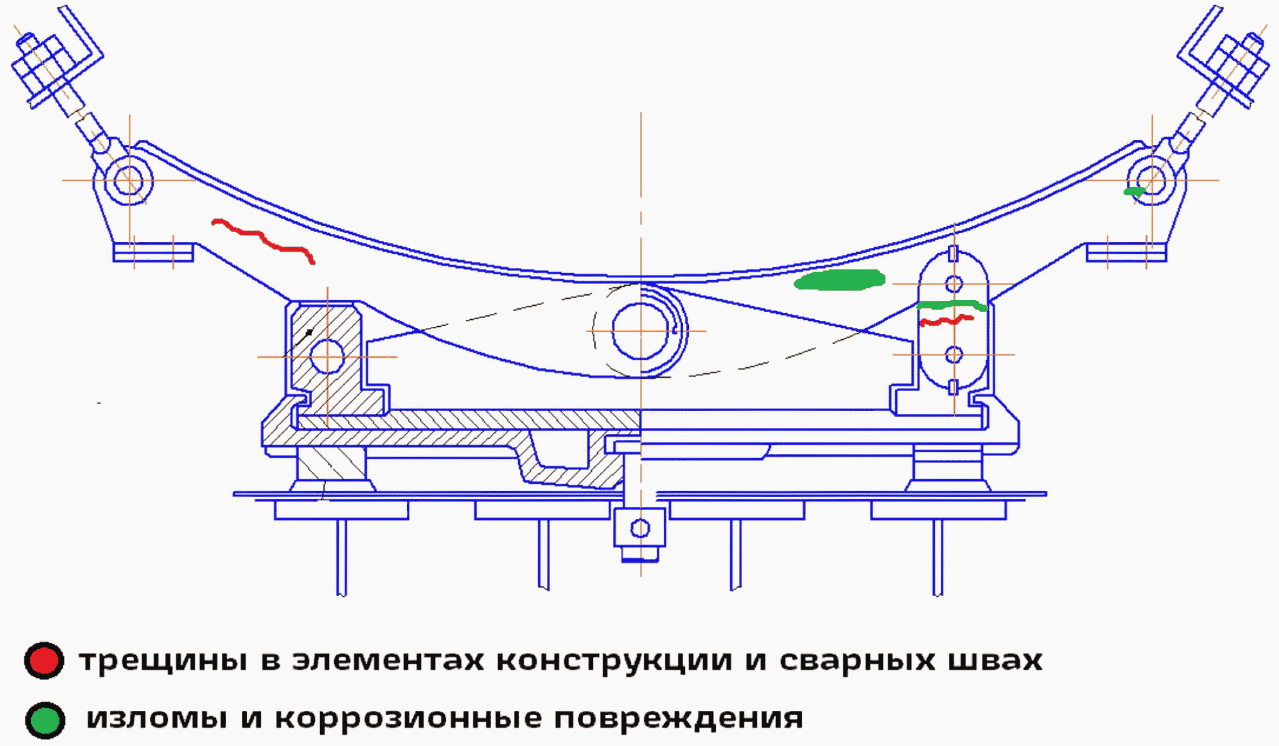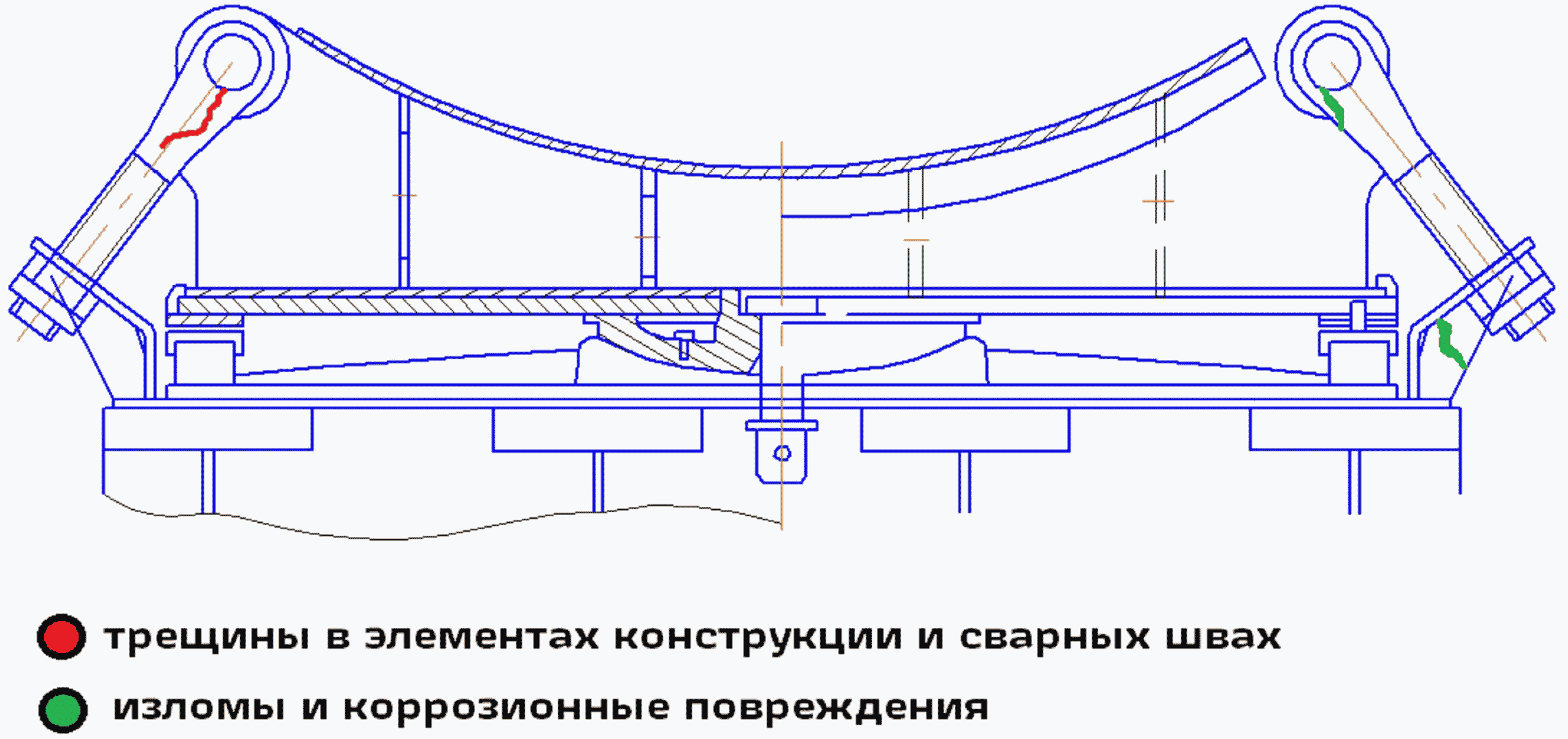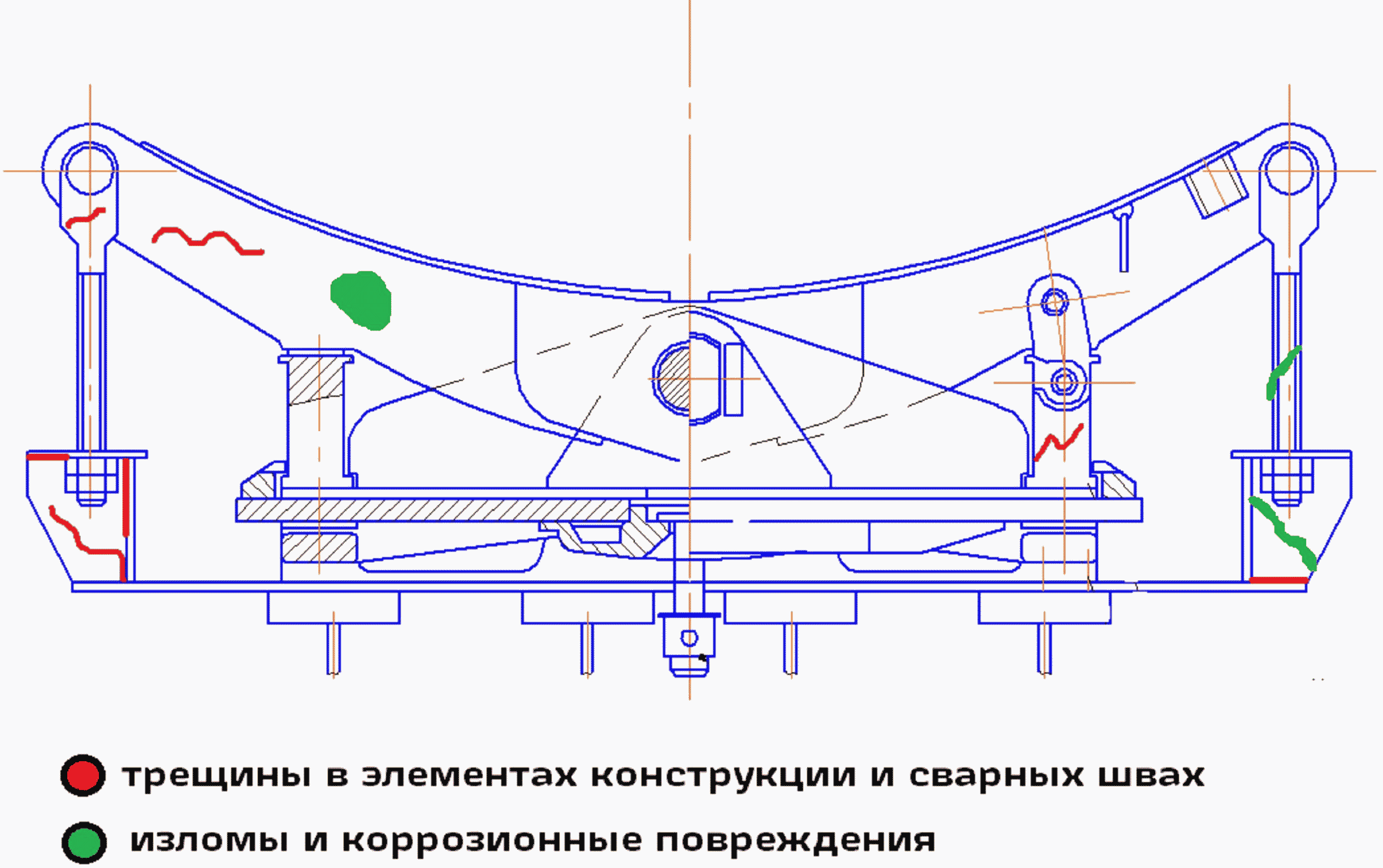 9.6 Амортизирующего устройства консолей (нажимных роликов, двойных рычагов, пальцев крепления рычагов, гидравлических цилиндров, резьбовых штанг и др.) | + | + | + | + | + |