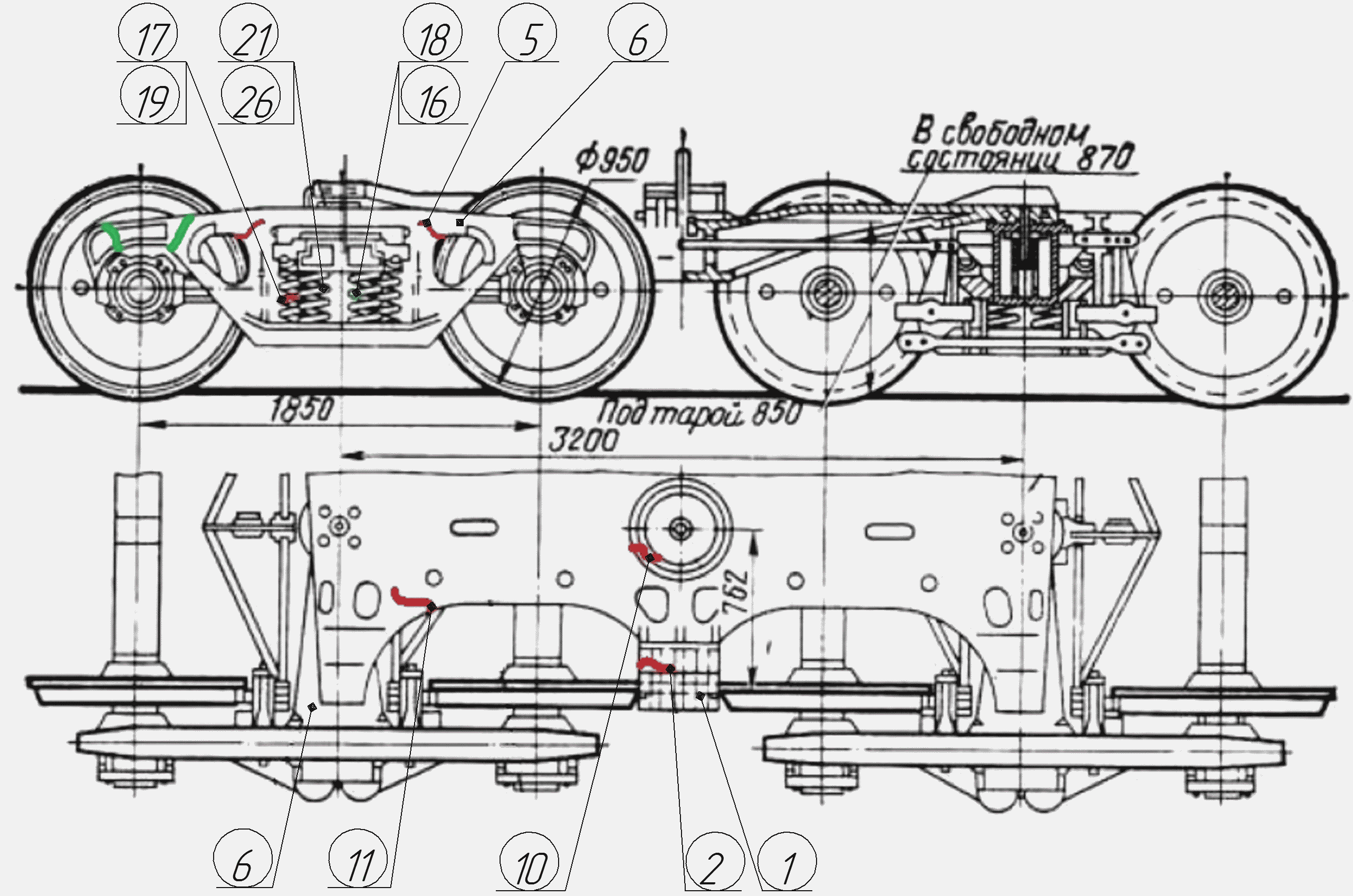 6 | Диаметр колеса по кругу катания | мм | 950 | 22 | Масса тележки | т | 4,64 |