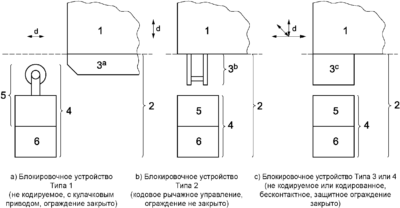 3.5 блокировочное защитное ограждение с фиксацией закрытия (interlocking guard with guard locking): Блокировочное защитное ограждение, снабженное устройством для механической фиксации ограждения и устройство с фиксацией закрытия, обеспечивающее с помощью системы управления машиной следующие функции безопасности: