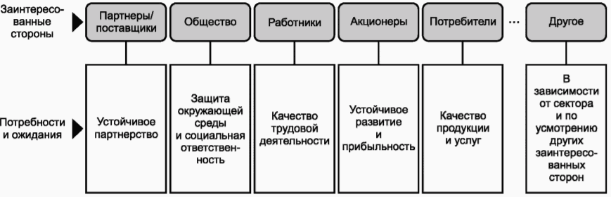Перечень заинтересованных сторон может значительно меняться с течением времени и отличаться в зависимости от организации, отрасли, культуры и страны. На рисунке 2 приведены примеры заинтересованных сторон и их потребностей и ожиданий.