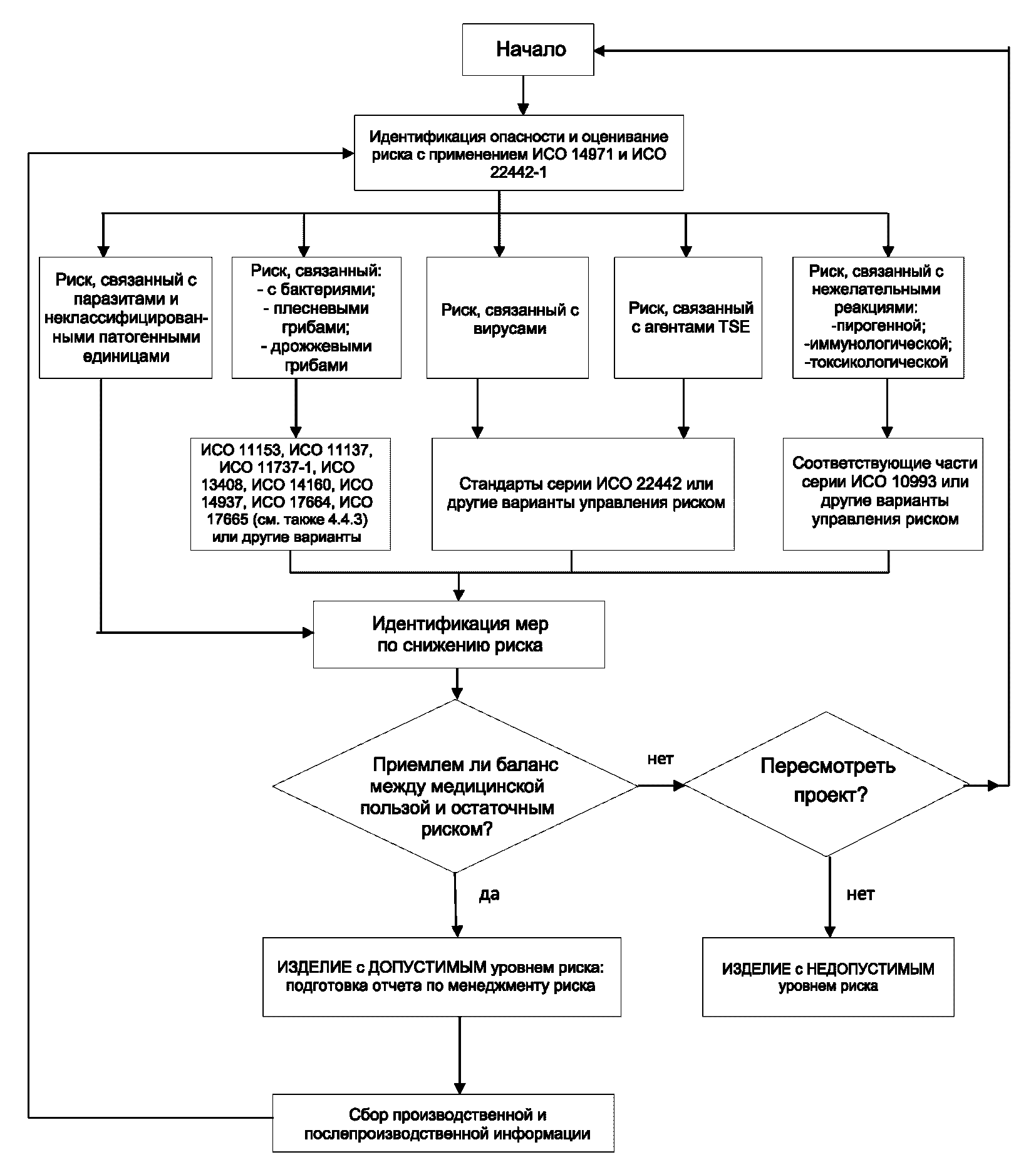 ИСО 14971 является общим стандартом, устанавливающим процесс для изготовителя путем идентификации опасностей и опасных ситуаций, связанных с медицинскими изделиями, включая медицинские изделия in vitro, для определения и оценивания рисков, связанных с данными опасностями, управления этими рисками и мониторинга результативности такого управления на протяжении всего жизненного цикла. Данный документ приводит дополнительные требования и руководство для оценки медицинских изделий, изготовленных с использованием тканей животного происхождения или их производных, которые не являются жизнеспособными или были приведены в такое состояние.