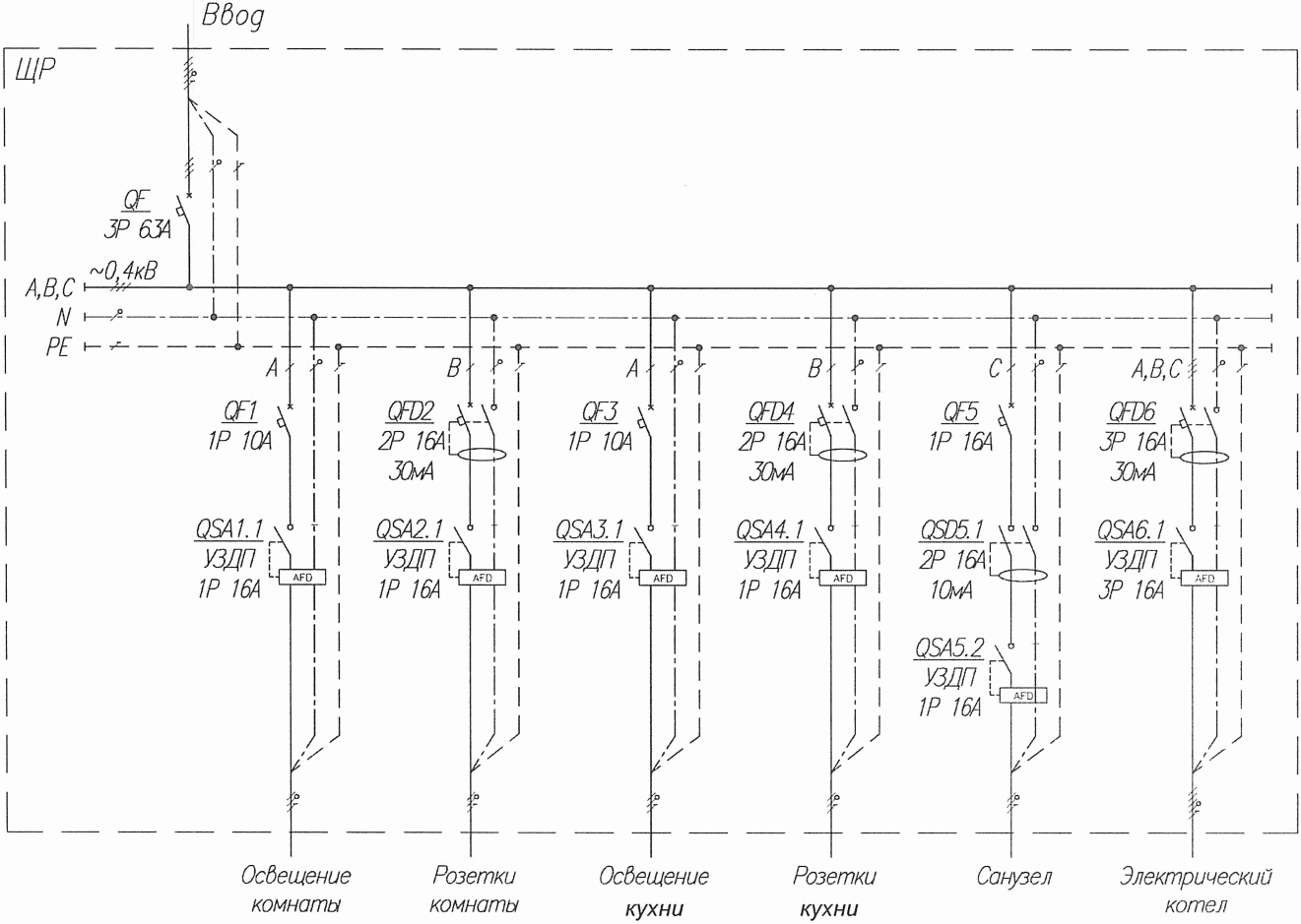 е) Подключение УЗДП с АВ и УДТ. Вариант двухполюсного УЗДП,