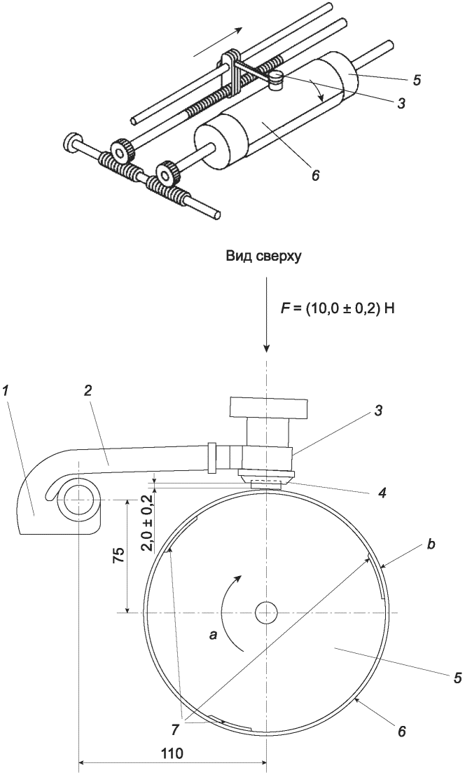 Цилиндрический образец резины скользит по абразивному листу определенной марки под определенным давлением на заданном пути. Во время испытания образец может вращаться или не вращаться. Абразивный лист должен быть прикреплен к вращающемуся цилиндрическому барабану, по которому перемещается закрепленный в держателе образец.