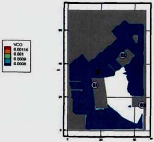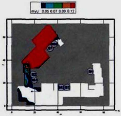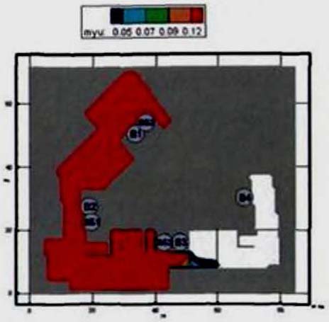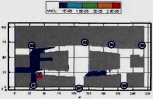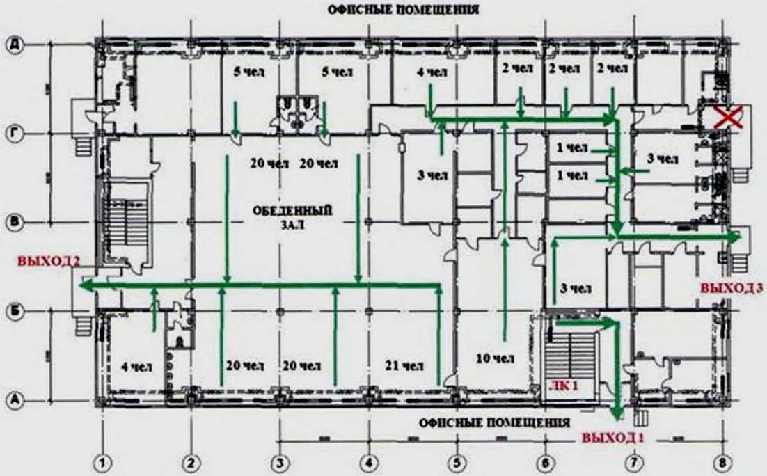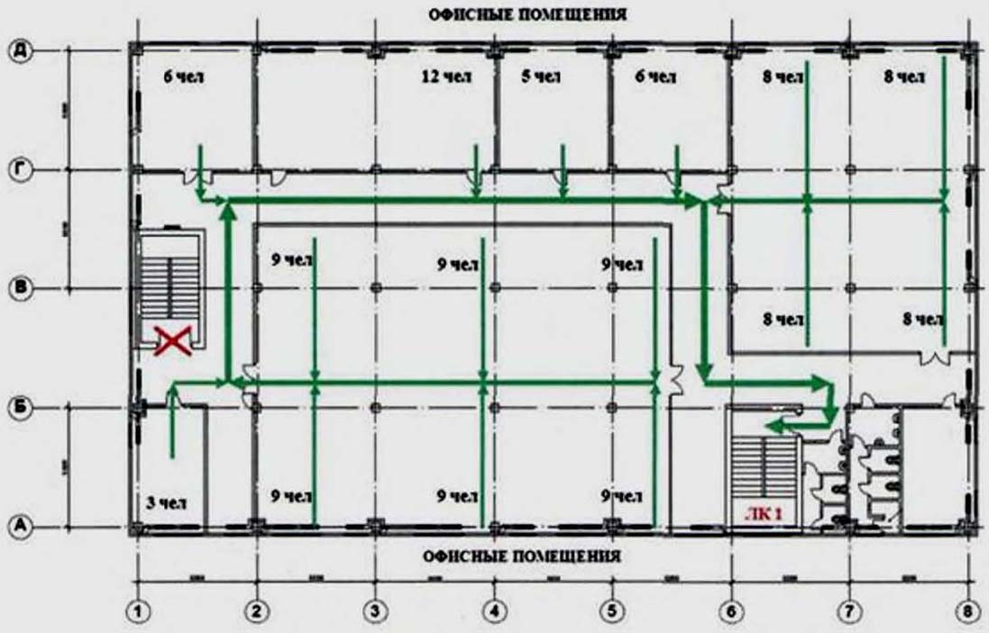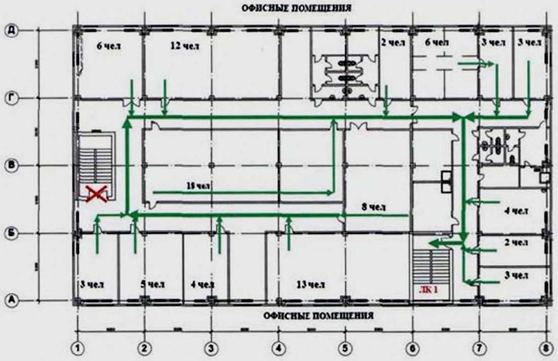 192). В соответствии с требованиями методики один выход с этажа блокируется. В рассматриваемом примере блокируется выход в осях 1-2/Б-В, так как в случае его функционирования через него будет эвакуироваться большее количество людей, чем через выход с этажа в осях 6-7/А-Б. В таком случае ЛК 1 будет испытывать максимальные нагрузки.