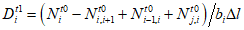Изменение плотности потока на каждом из элементарных участков в последовательные моменты времени зависит от количества людей, переходящих через границы участков. В общем случае количество людей, переходящих за интервал времени