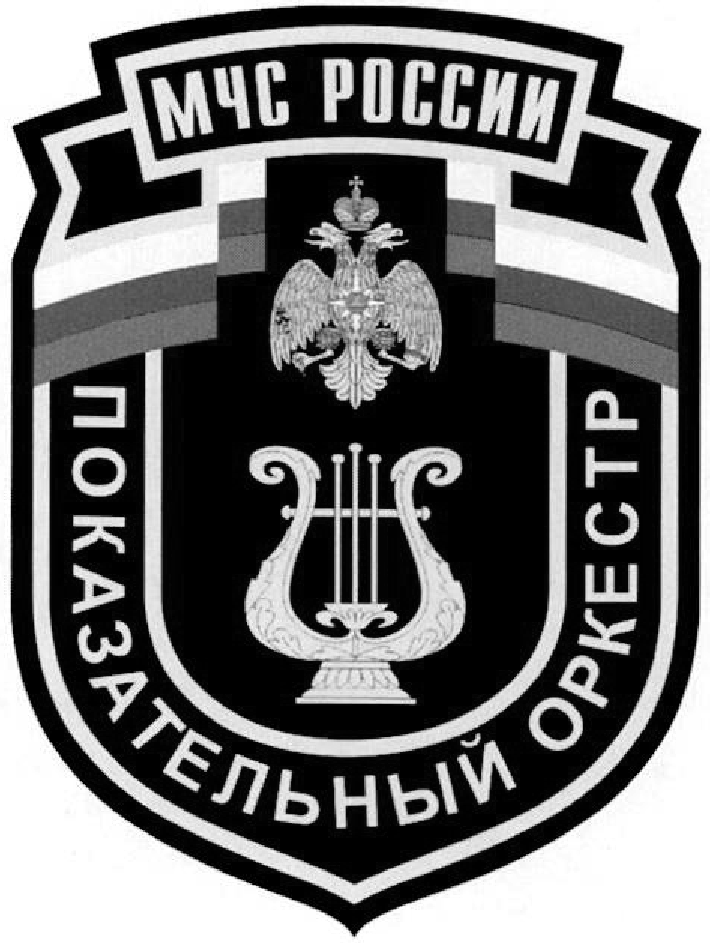 3. Нарукавный знак на парадную и специальную форму одежды сотрудников и работников Показательного оркестра Министерства Российской Федерации по делам гражданской обороны, чрезвычайным ситуациям и ликвидации последствий стихийных бедствий выполнен в виде щита фигурной формы (высота 110 мм, ширина 95 мм) черного цвета с золотистой окантовкой. В верхней части щита - изображение двуглавого орла золотистого цвета с опущенными крыльями, увенчанного короной, держащего в правой лапе скипетр, а в левой - державу. На груди орла - вытянутая по вертикали звезда белого цвета с восьмью лучами, в центре которой в круге оранжевого цвета расположен равносторонний треугольник голубого цвета с основанием внизу. Под орлом располагается лира золотистого цвета. Над орлом - преломленный Государственный флаг Российской Федерации. В верхней части щита буквами золотистого цвета в один ряд нанесена надпись: "МЧС РОССИИ", в нижней части щита - "ПОКАЗАТЕЛЬНЫЙ ОРКЕСТР". Располагается на правом рукаве форменной одежды на расстоянии 80 мм от верхней кромки шва рукава.
