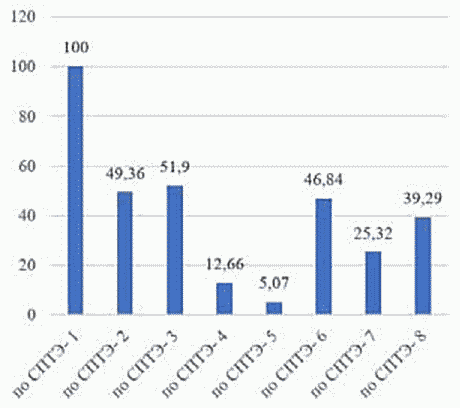 табл. 3), можно сказать, что во всех СЭУ ФПС МЧС России есть эксперт(ы), имеющий допуск к СПТЭ-1. Эксперты по СПТЭ-2 отсутствуют в 50,63% СЭУ, эксперты по СПТЭ-3 отсутствуют в 43,1% СЭУ, эксперты по СПТЭ-4 - в 87,34%, по СПТЭ-5 отсутствие составляет 94,93%, по СПТЭ-6 отсутствие составляет 53,16%, по СПТЭ-7 отсутствие составляет 74,68%, по СПТЭ-8 - 60,75%. Как видно из статистических данных, ситуация с достаточным наличием аттестованных экспертов в СЭУ находится на низком уровне.