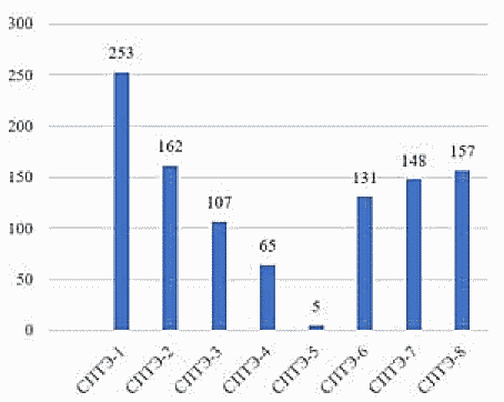 2) говорит о том, что наибольшее количество экспертов в период с 2017 г. по 2021 г. обучалось по СПТЭ-1 "Реконструкция процесса возникновения и развития пожара", а наименьшее количество - по СПТЭ-5 "Термический анализ при исследовании объектов СПТЭ". Учитывая аналитические данные (