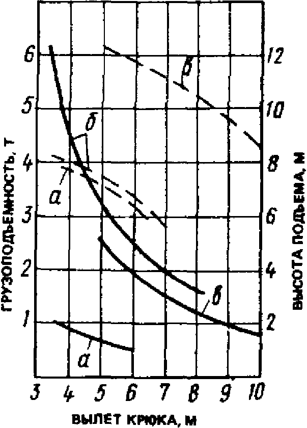 а - со стрелой 10 м без выносных опор; б - на выносных