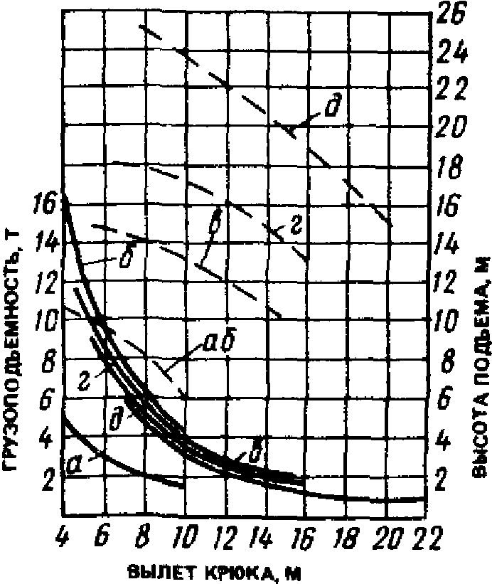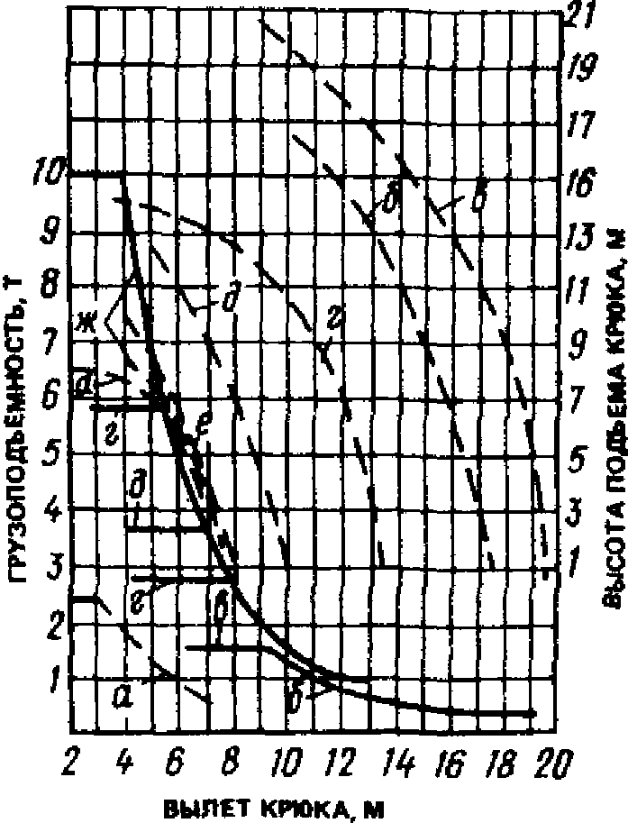 г - со стрелой 14 м; д - 12 м; е - 10 м; ж - 8 м