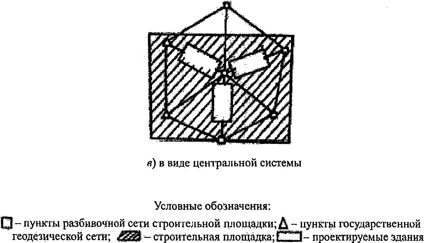 5.1. Геодезическую разбивочную основу на строительной площадке или вблизи объекта строительства следует создавать в виде сети закрепленных знаками геодезических пунктов в местах, обеспечивающих их сохранность на весь период строительства с учетом удобства, определения положения здания (сооружения) на местности и обеспечивающих выполнение дальнейших построений и измерений в процессе строительства с необходимой точностью.
