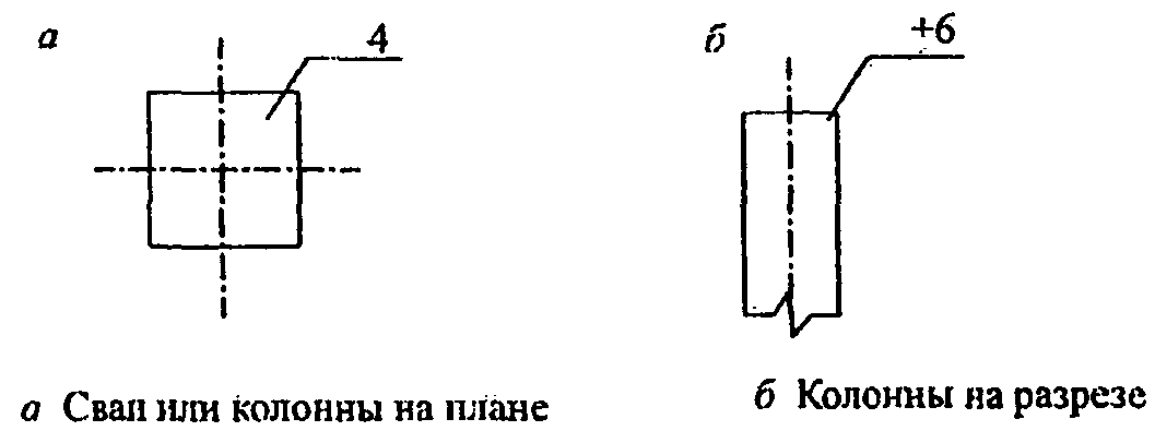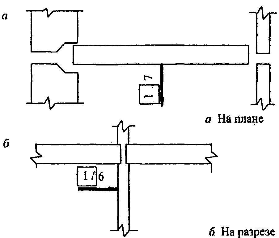 марка в полу; 7 - осадочная марка на колонне (стене)