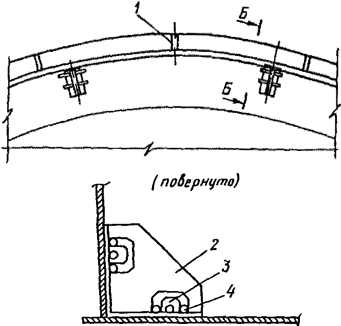 3.4. При погрузке на железнодорожные транспортеры сцепного типа рулоны укладываются в ложементы, находящиеся друг от друга на расстоянии по осям 12,36 м. Поверхность соприкосновения ложемента с рулоном выстилается досками длиной 1 м и толщиной не менее 30 мм, а крепление рулона к ложементу производится бандажами из полосовой стали с помощью инвентарных винтовых стяжек.