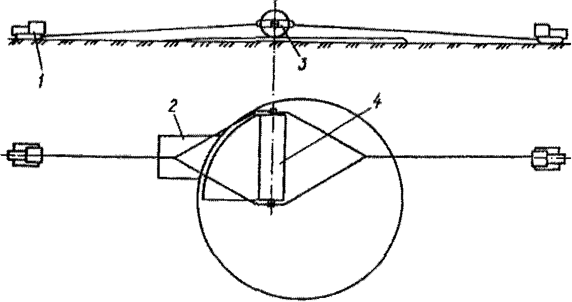 2. На прямой линии, отклоненной от касательной к уторной окружности на угол не более 30° и на расстоянии 15 - 35 м от основания данной образующей устанавливается теодолит.