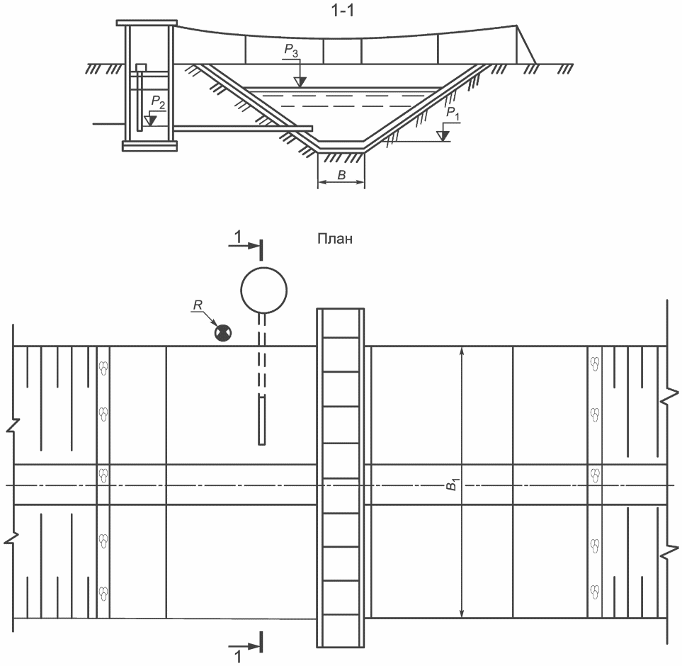 5.14 Не допускается применение успокоительных устройств типа выносных колодцев в каналах со скоростью потока более 1,5 м/с и шириной русла менее 10 м.