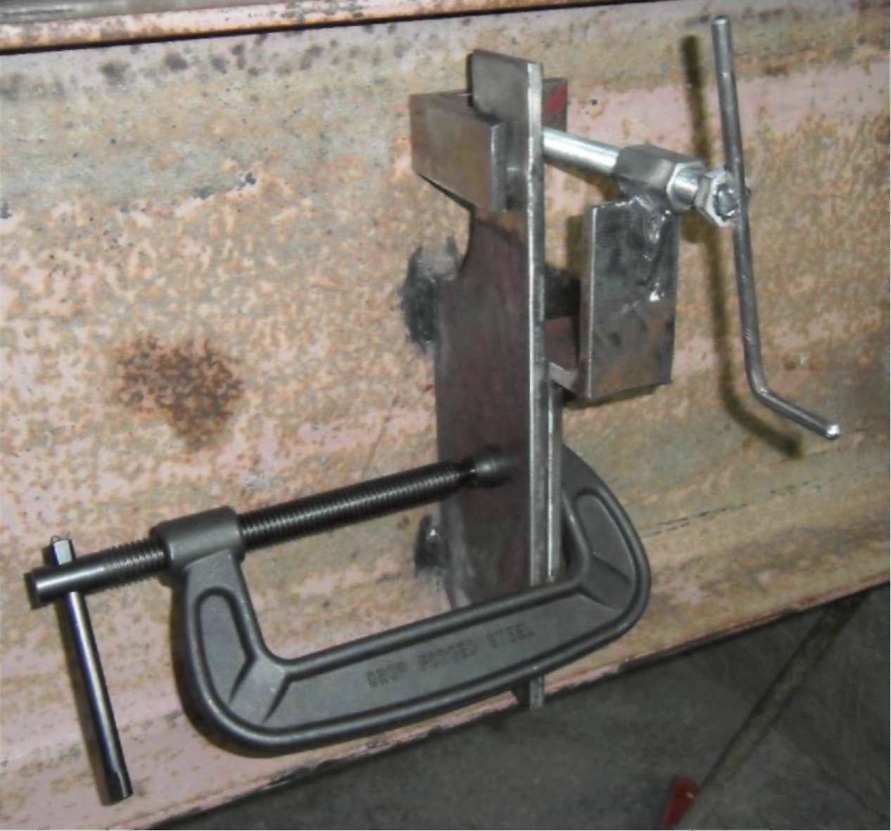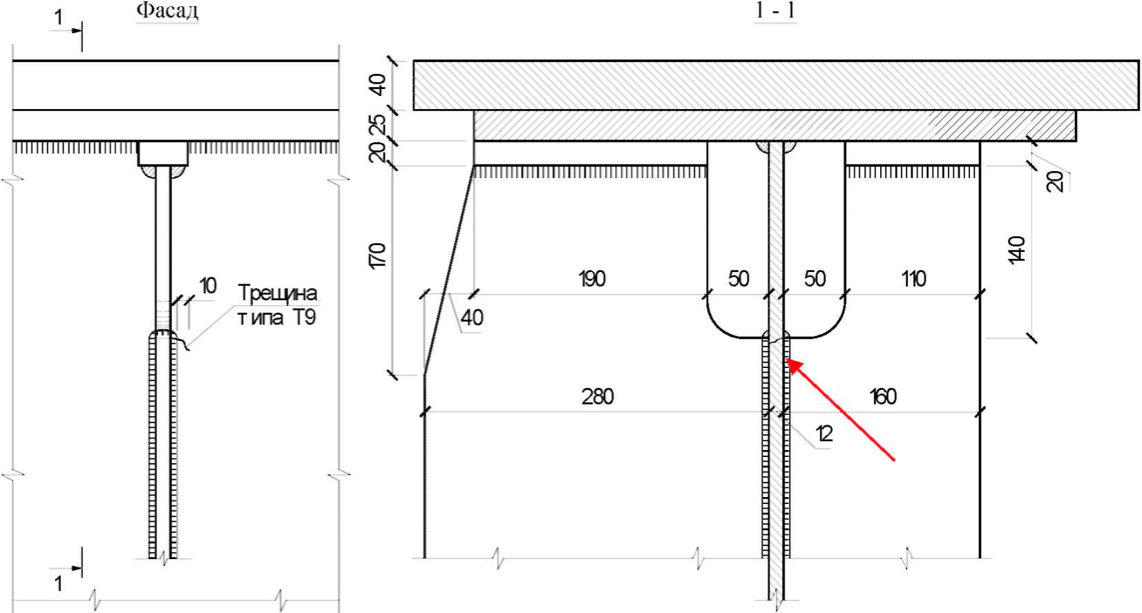 1.3. Инструкция регламентирует технологии ремонта усталостных трещин типа Т-9 и Т-10, расположенных в стенках главных балок у верхних и нижних концов сварных швов вертикальных ребер жесткости. Пример трещины типа Т-9 показан на рисунке 1.1. Технологии ремонта основаны на методе индукционного нагрева и индукционной пайки и предназначены для ремонта сварных металлических пролетных строений, выполненных по типовым проектам инв. N 541, 563, 690, 739, 821, 930, 1293, 1293К, разработанным проектными институтами "Гипротрансмост" и "Ленгипротрансмост".