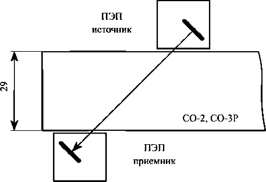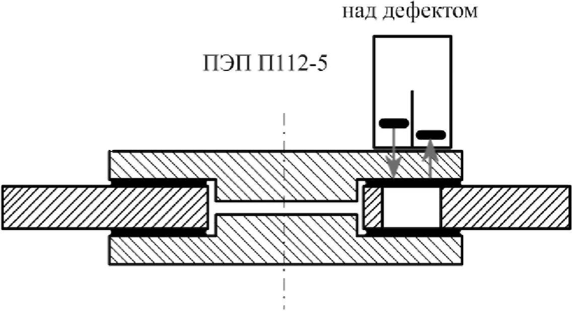 рисунком Г8.7 таким образом, чтобы оси ПЭП совпадали и акустическая ось проходила через середину паяного соединения. Перемещая ПЭП в пределах не более половины диаметра ПЭП добиться максимальной амплитуды прошедшего импульса.