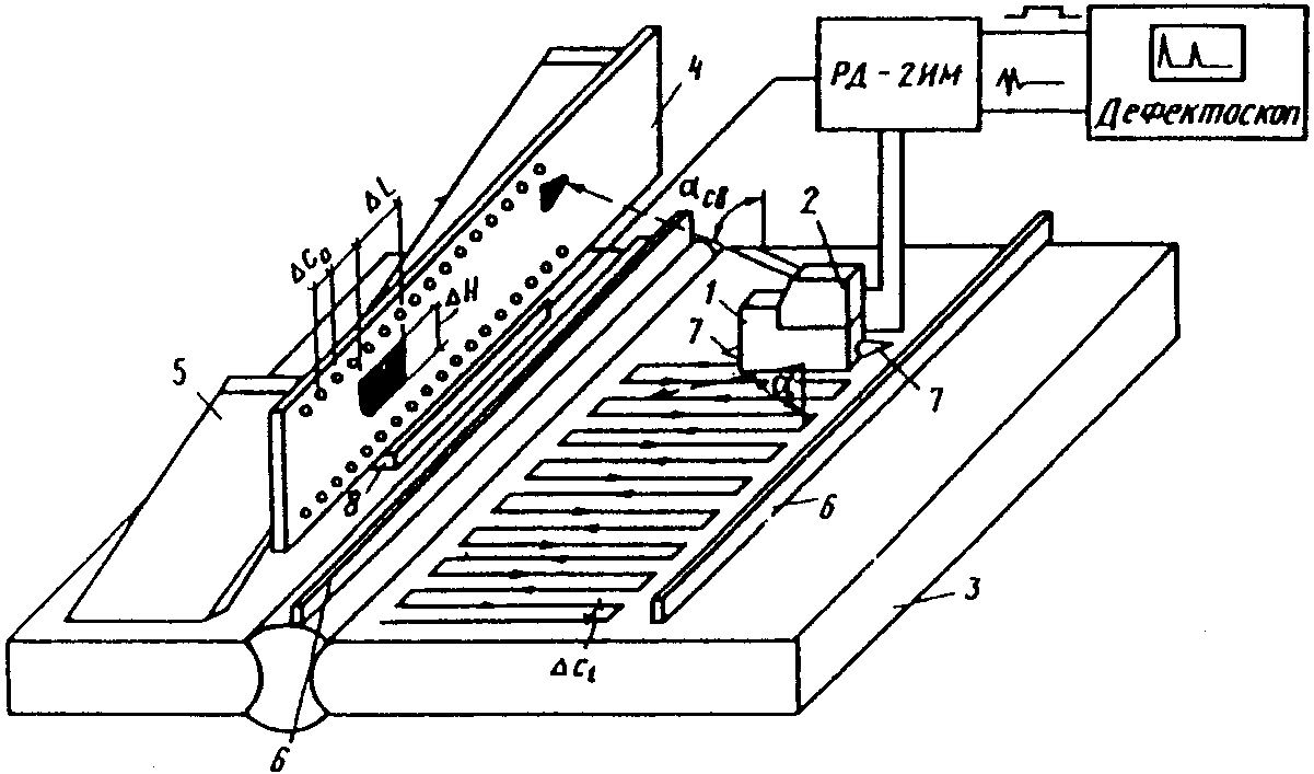 способ прозвучивания (прямым или однократно отраженным лучом), схема сканирования (поперечно-продольное, продольно-поперечное, продольное) и параметры сканирования (угол ввода луча, шаг сканирования, пределы поперечного смещения преобразователя, превышение чувствительности поиска над чувствительностью оценки) и чувствительность оценки (предельная, условная или эквивалентная);