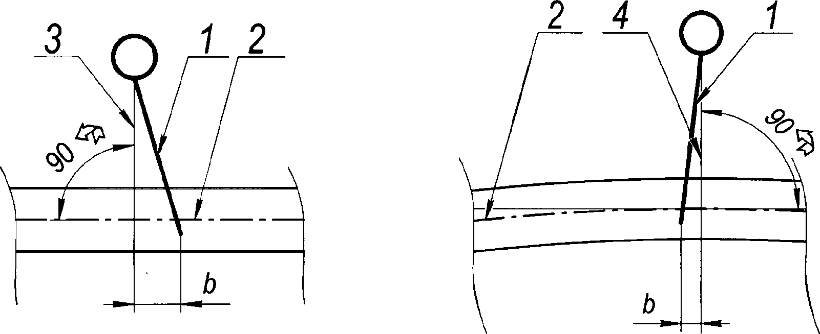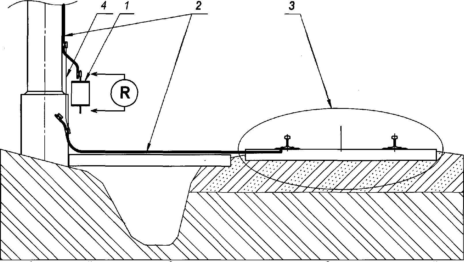 1 - контактная подвеска, 2 - зона повреждения, 3 - несущий трос, 4 - контактный провод.