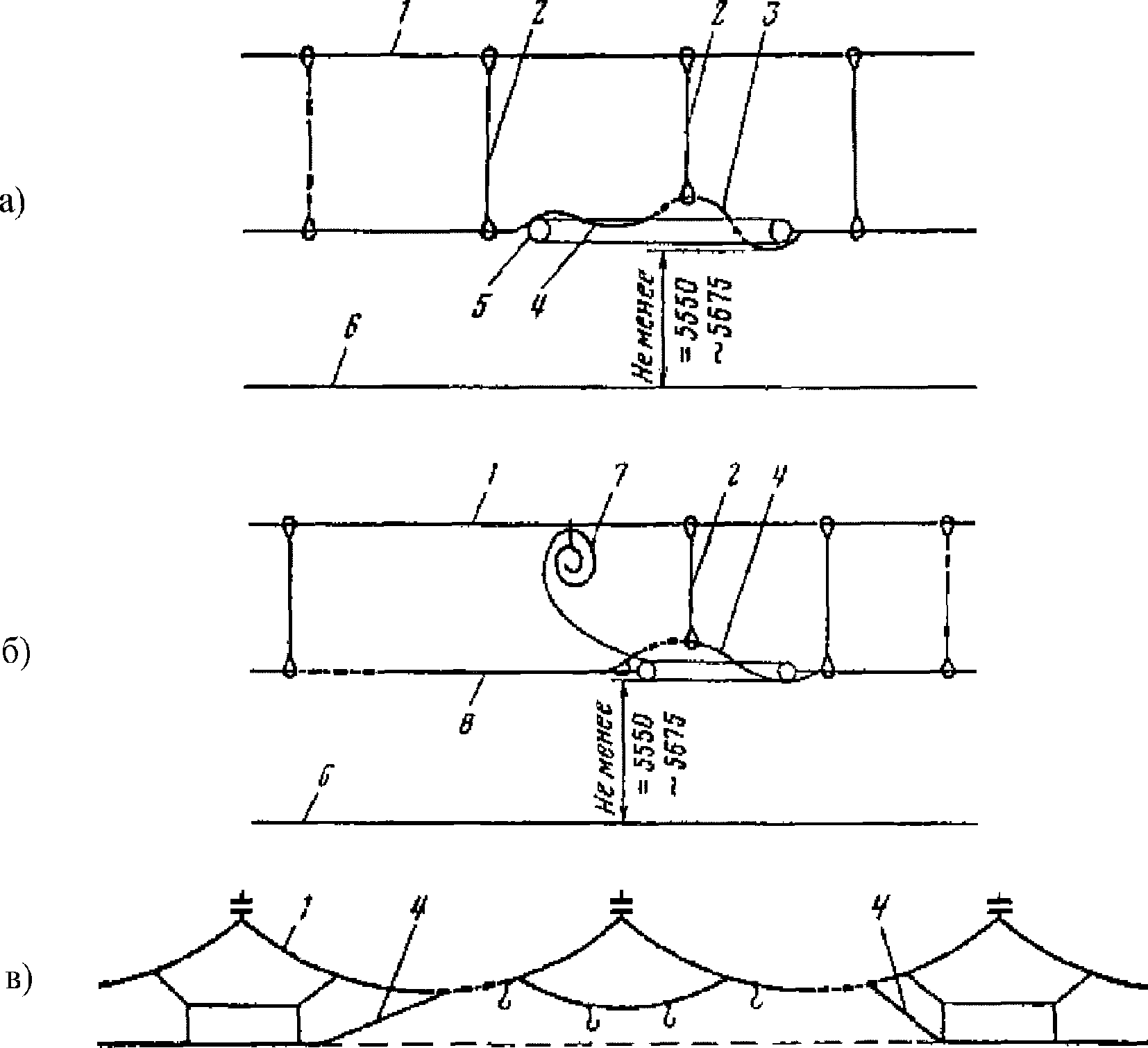 (рисунок Д.11); стыковку медных, сталемедных и стальных несущих тросов осуществляют шестью соединительными зажимами, сталеалюминиевых - четырьмя, подстыковку контактного провода к несущему тросу - тремя соединительными зажимами